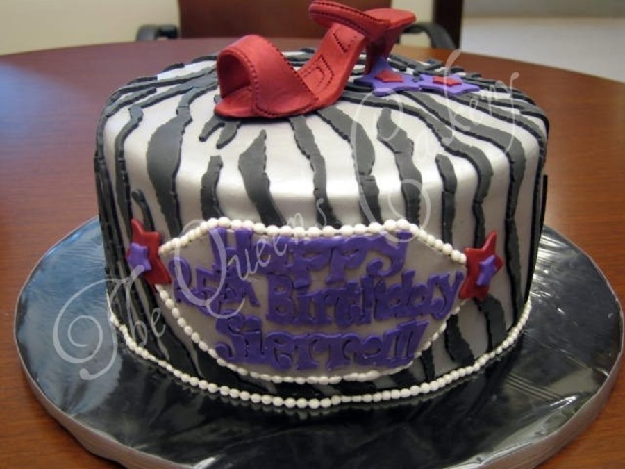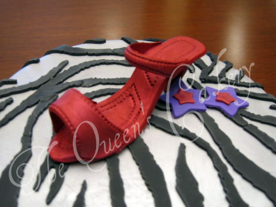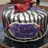 8" chocolate fudge cake with buttercream filling. Fondant was tinted gray then painted with silver luster dust. Black zebra stripes and inscription were designed in Make The Cut and cut using the Cricut Cake. This was my first time using the Cricut and it worked beautifully. I wasn't too keen on the red and purple on this cake, but it's exactly what the client wanted. First attempt at a gumpaste shoe as well. Thanks for looking!