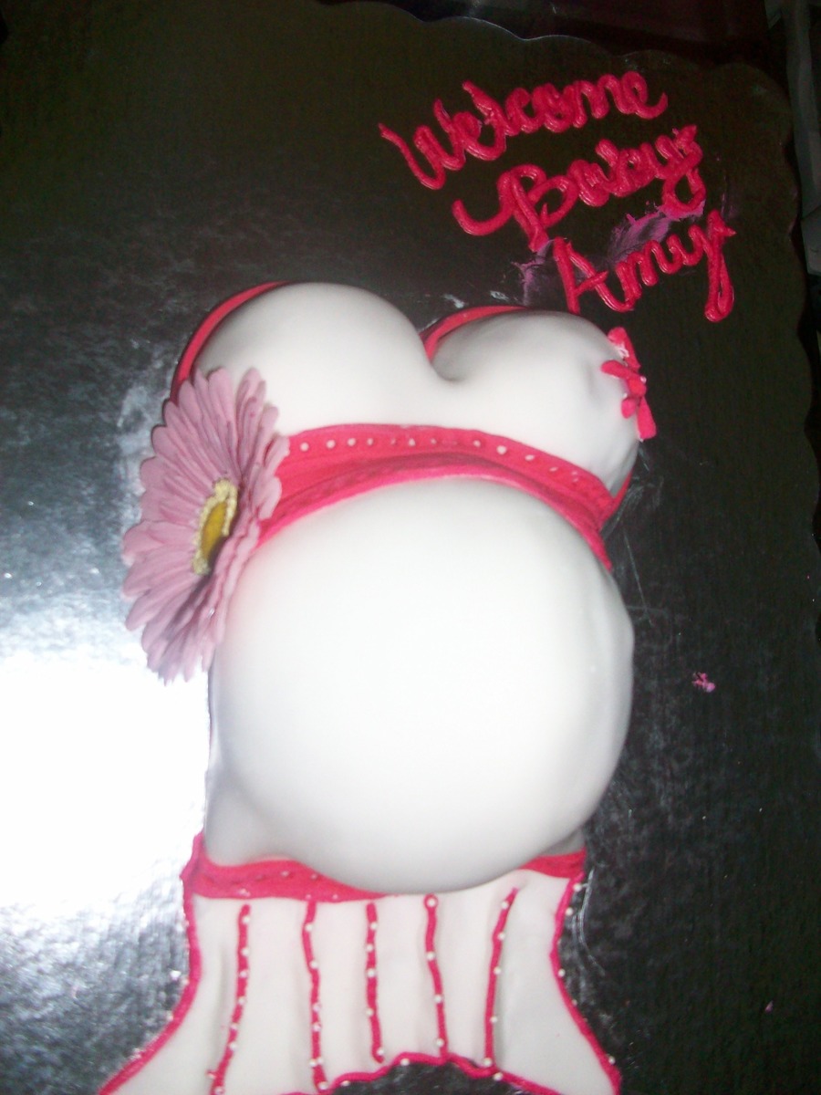 This was my first try at a belly cake. I see them on here all the time, they are so cute.so any comments and suggestions are welcome! I use the wilton sports ball for the belly and wonder mold pan for the boobs ... i would like to no how to add the foot print if someone could help me with that thanks alot.