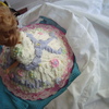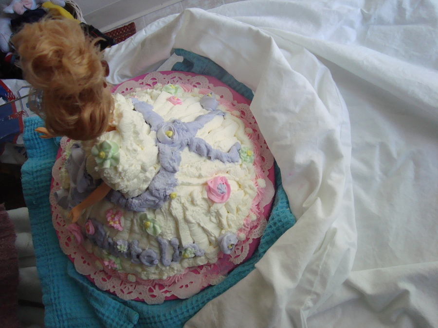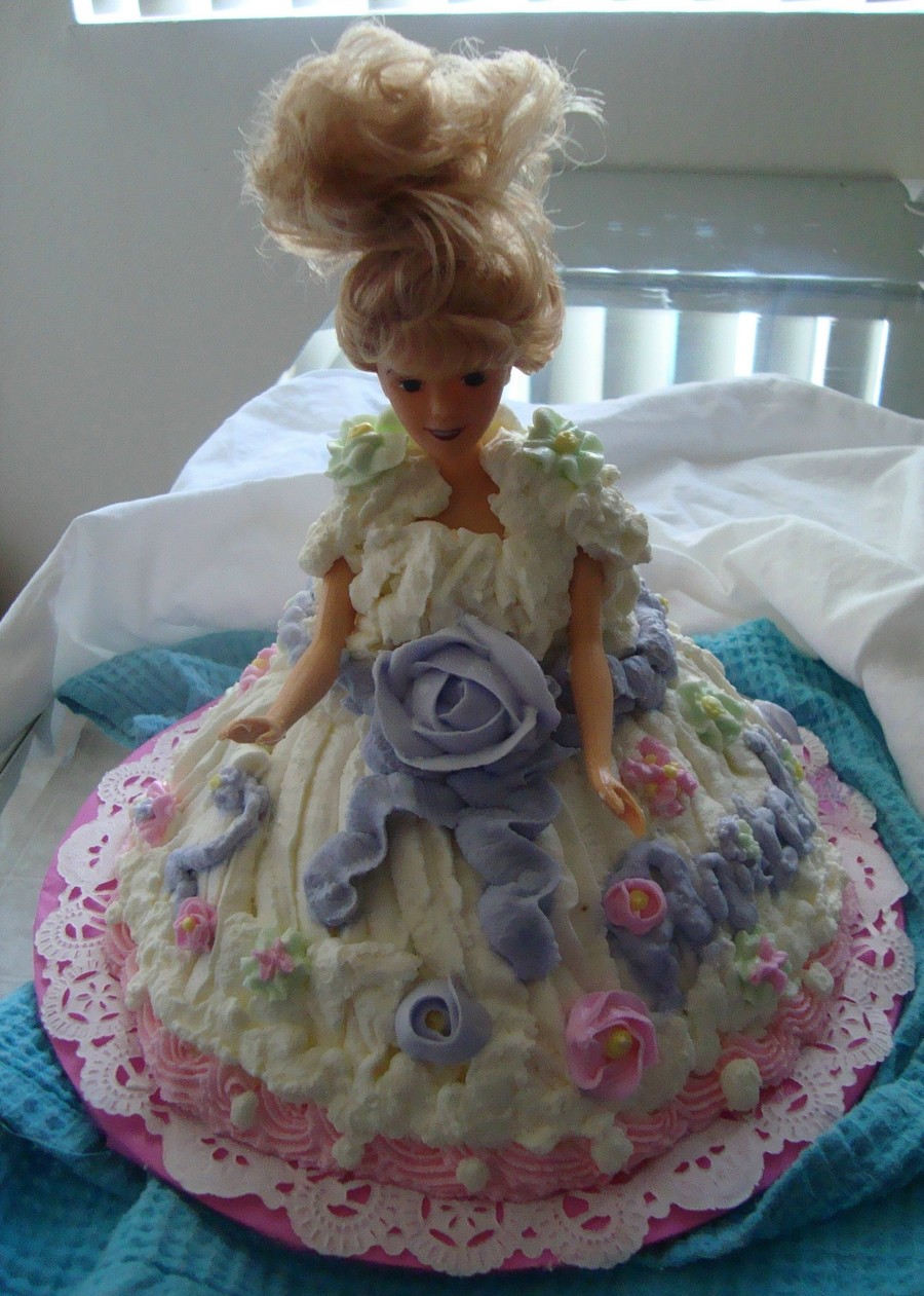 This was made out of whipped cream icing,,so it's poofy looking..with royal icing flowers. thanks for looking!
