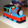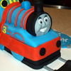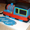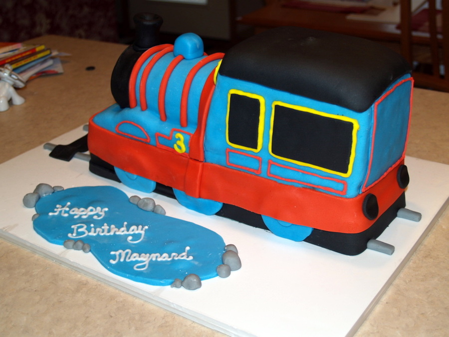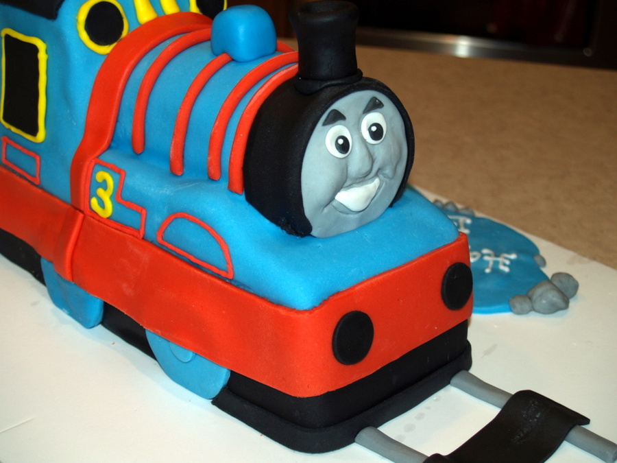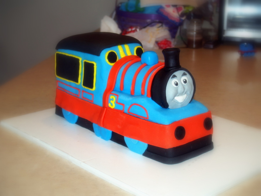 Thomas and I did not get along! This was my first Thomas cake and probably my last. YOu cannot tell from this picture but the rear end of Thomas was sinking this morning. I had to cut the back section off, completed rip off the fondant , redecorate the back and then reassemble. I had a cake meltdown in my kitchen in front of my poor 2 year old daughter! Carved from an 11x15.