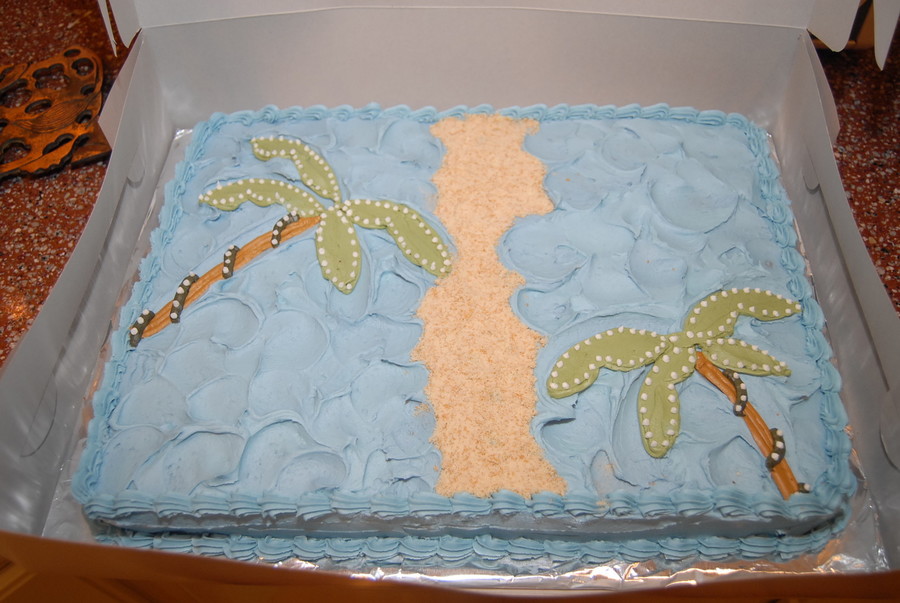 Cake to match an invitation. Was two sheet cakes (9x13 each) put together. All decorations were buttercream except for the sand. The sand was crushed nila wafers