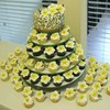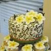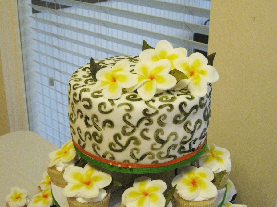 I did this wedding cake for my best friend that had taken a recent trip to Barbados with her fiance, and discovered this flower there. She photographed them and mentioned to me how pretty they were, and asked if I could tie them into the cake somehow. We had already discussed other flowers, but I told her I would try---I had never done a frangipani before. I said I could maybe do a few for the topper, but mostly stick to the original design. Needless to say, I surprised her and her fiance by making over 130 frangipanis for these cupcakes. They were thrilled! Cake topper is 8 inch round iced in buttercream, covered in fondant. Hand painted using petal dust and pure vanilla to create triple scroll design that the bride designed. (Minor damage from 2 hours of travel). 120 cupcakes, french vanilla and devils food chocolate with buttercream swirl. Frangipani flowers were handmade from fondant, painted with petal dust and lightly coated with daffodil luster duster to give some sheen to the yellow. The leaves were cut and pressed with leaf veiner and painted in various shades of green luster dust.