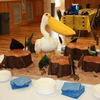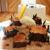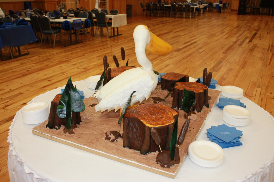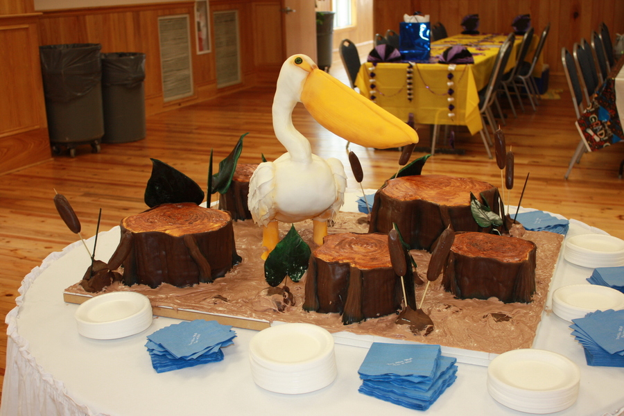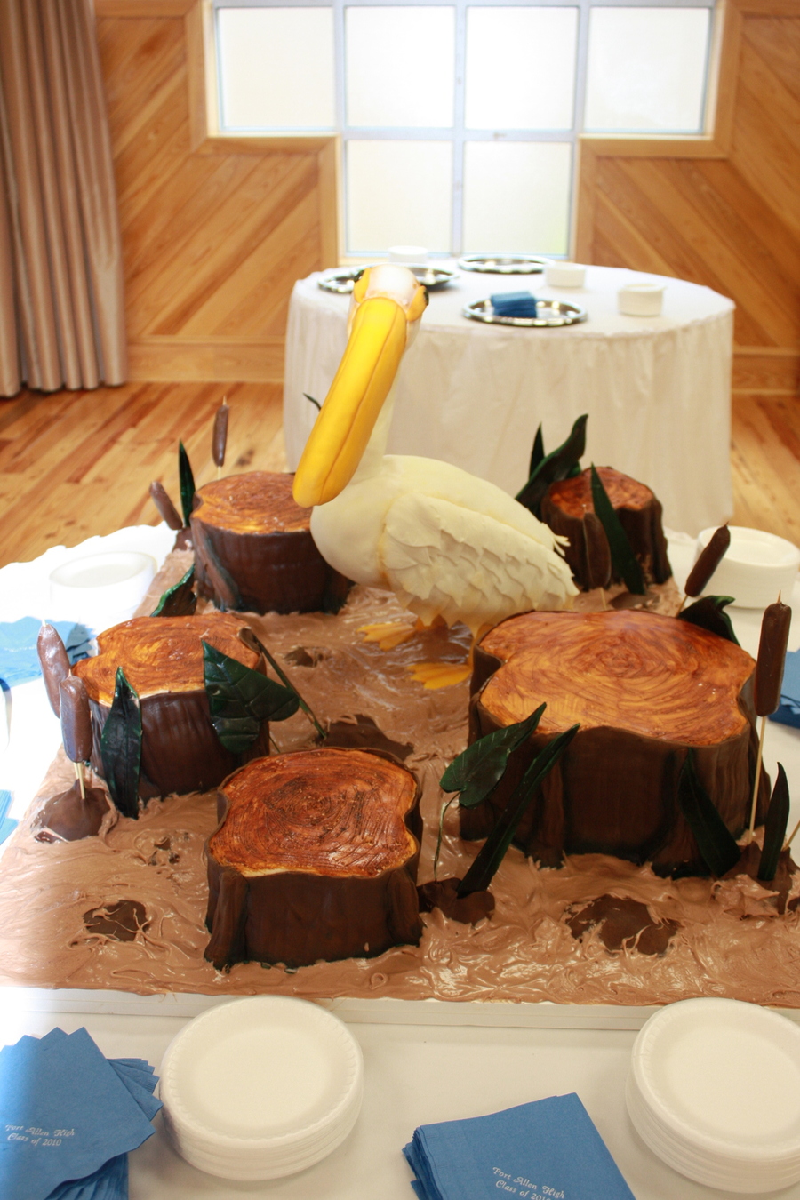 This was actually the centerpiece for a local high school's graduation party. The pelican is fondant and modeling chocolate covered stirophome. The stumps were the cake.