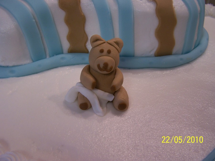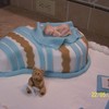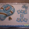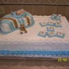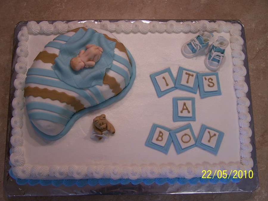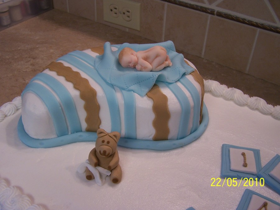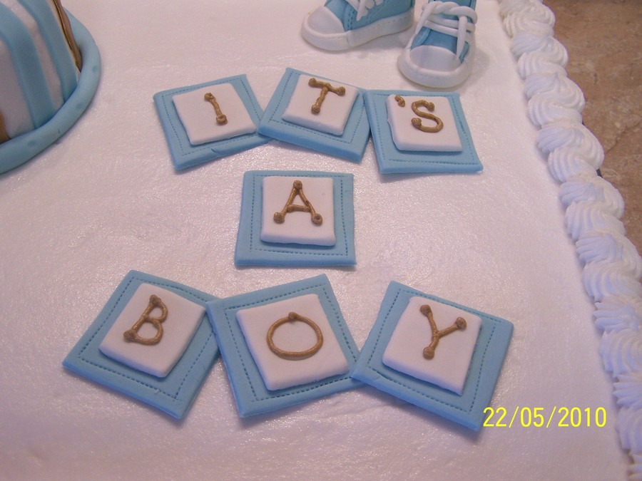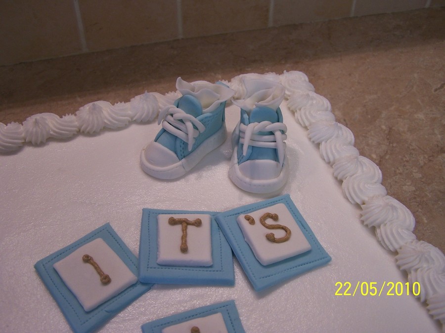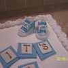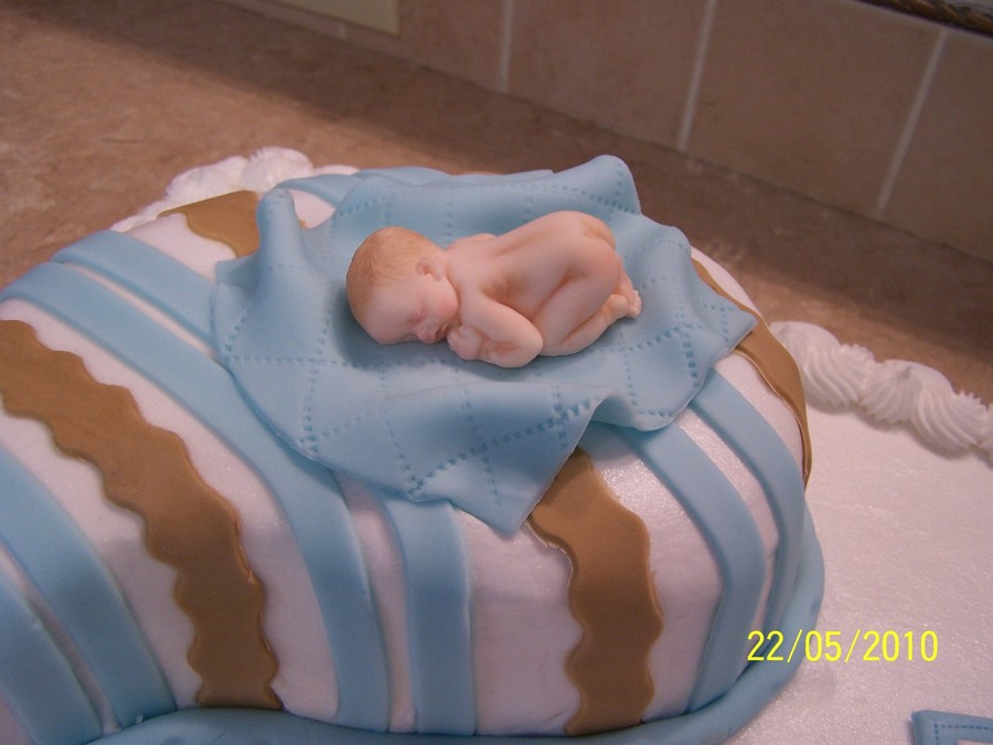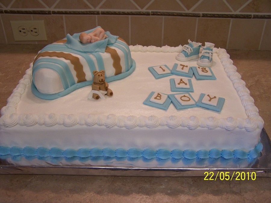 This baby shower cake was for a friend, first time making the shoes and baby. Thank you albie333 for the idea on the stripes. Thanks for looking. :)