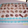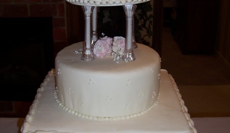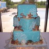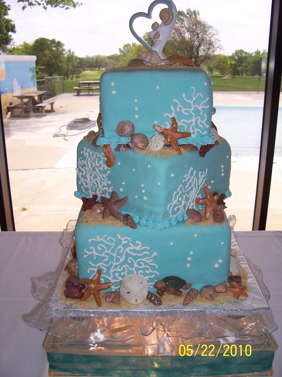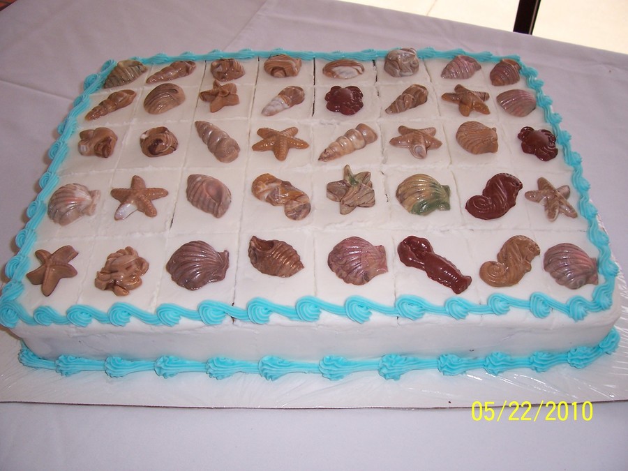 red velvet cake covered in fondant with chocolate seashells and vanilla wafers crushed for sand