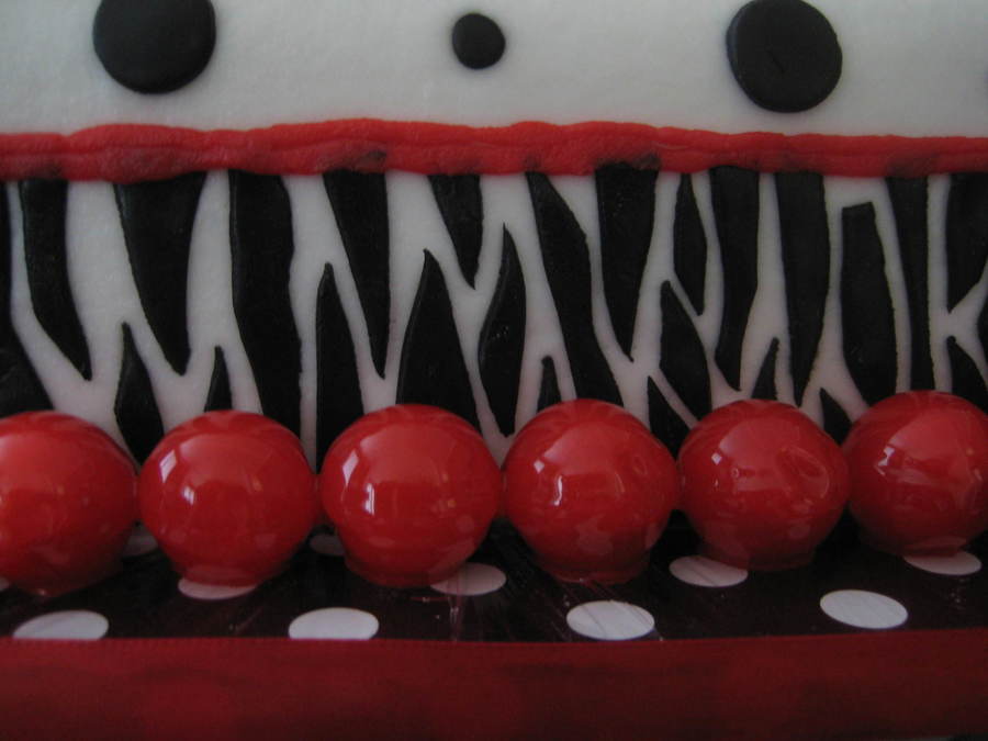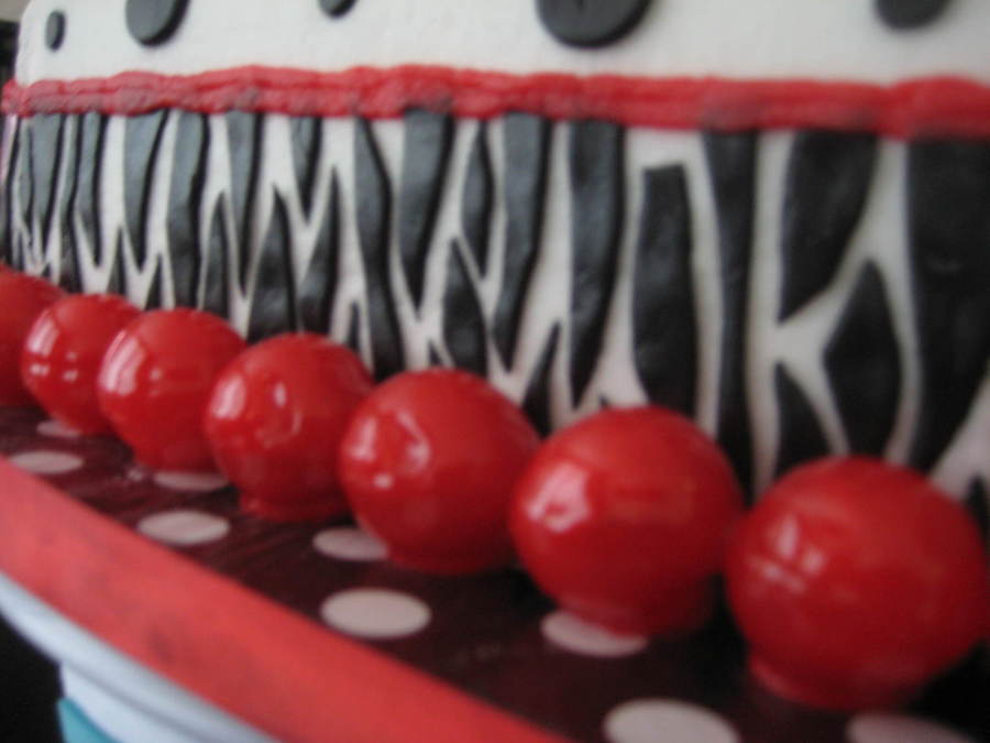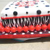 Strawberry cake with vanilla buttercream. Fondant accents and red gumballs. The board is covered in wrapping paper and then cling wrap. This cake was so much fun to decorate!