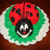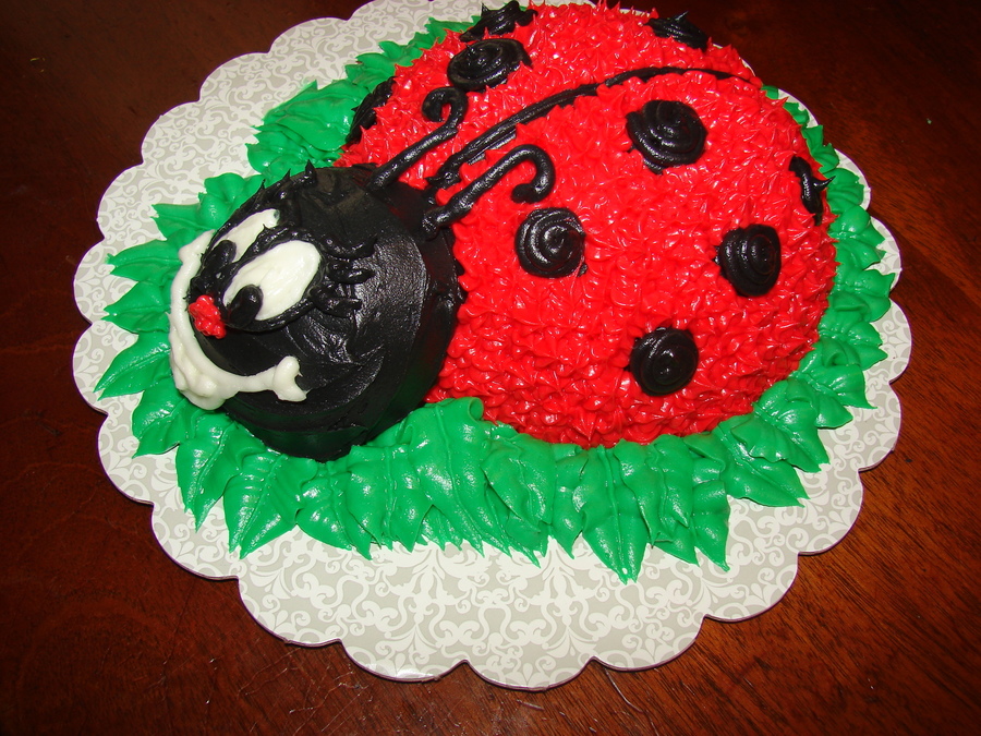 This is a ladybug cake that I did for a 2-year old's birthday. I used half of the sports ball pan for the body, and the mini ball pan for the head. It's a red velvet cake with bc frosting