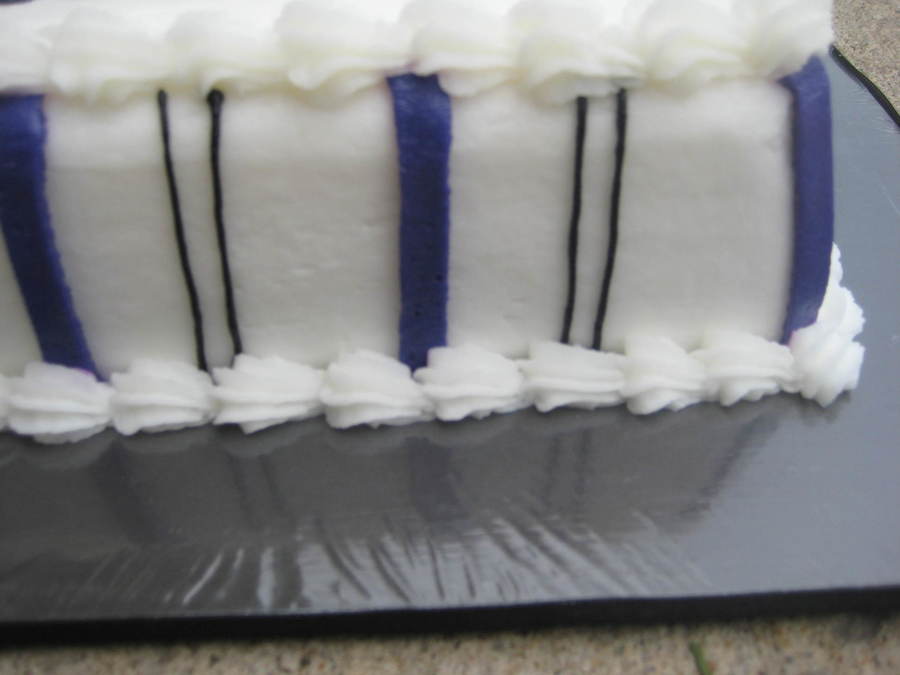 Chocolate sheet cake with vanilla buttercream. Logos are done in a frozen buttercream transfer (my first attempt!). I'm not a fan of the wormy lines but for my first try I think the logos turned out great!