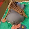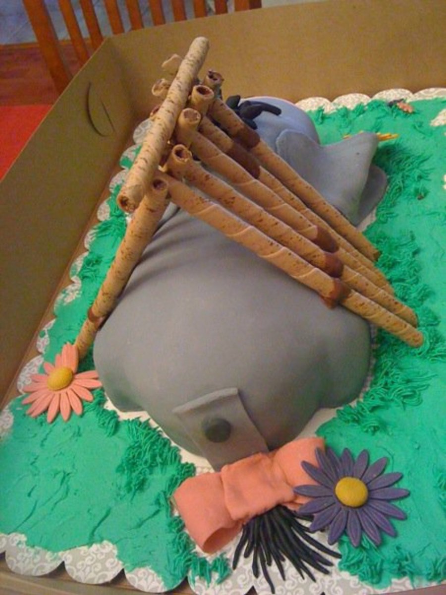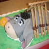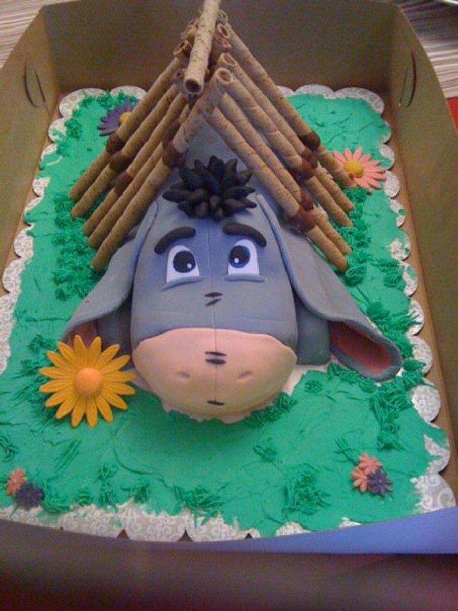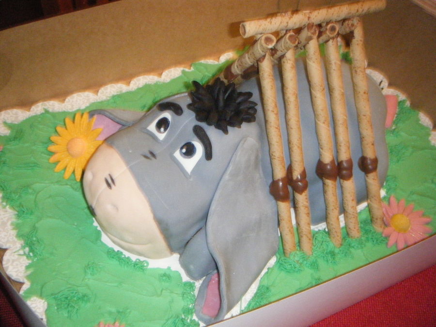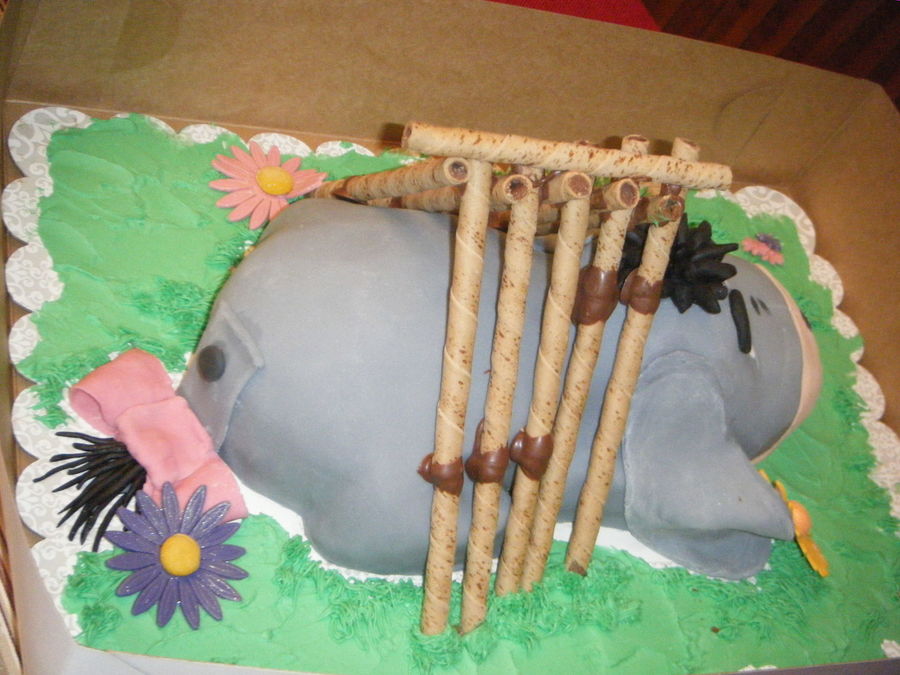 A friend asked for an Eeyore cake for his mom. Body and head were carved from oval/egg shaped pans. Flowers and body are fondant. His "house" are cookie sticks put together with melted chocolate for glue.
