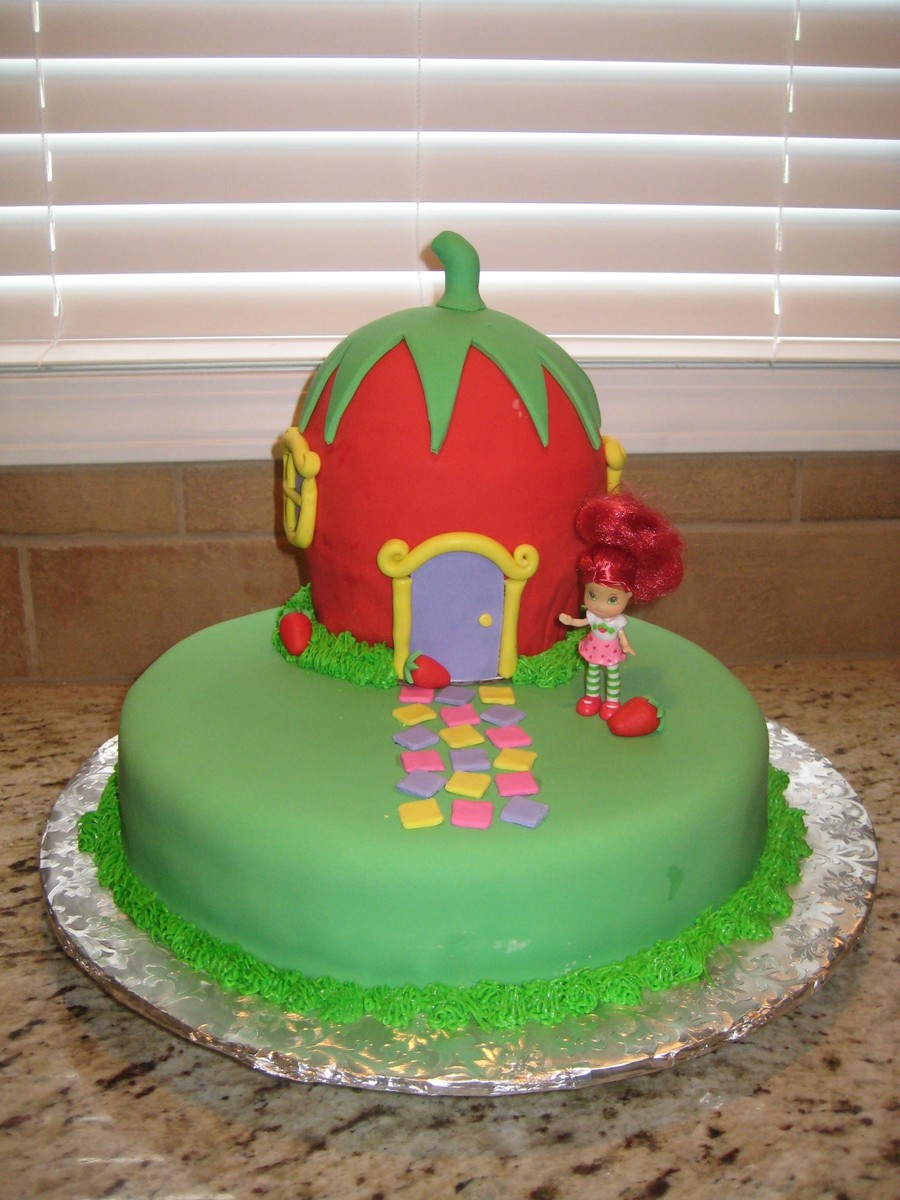 Cake made for my niece's birthday. Bottom is 1 10" round, torted. Strawberry is 2 6" rounds, with 1/2 ball pan on top. Covered in fondant, with gumpaste/fondant accents & buttercream border. Doll was purchased:)