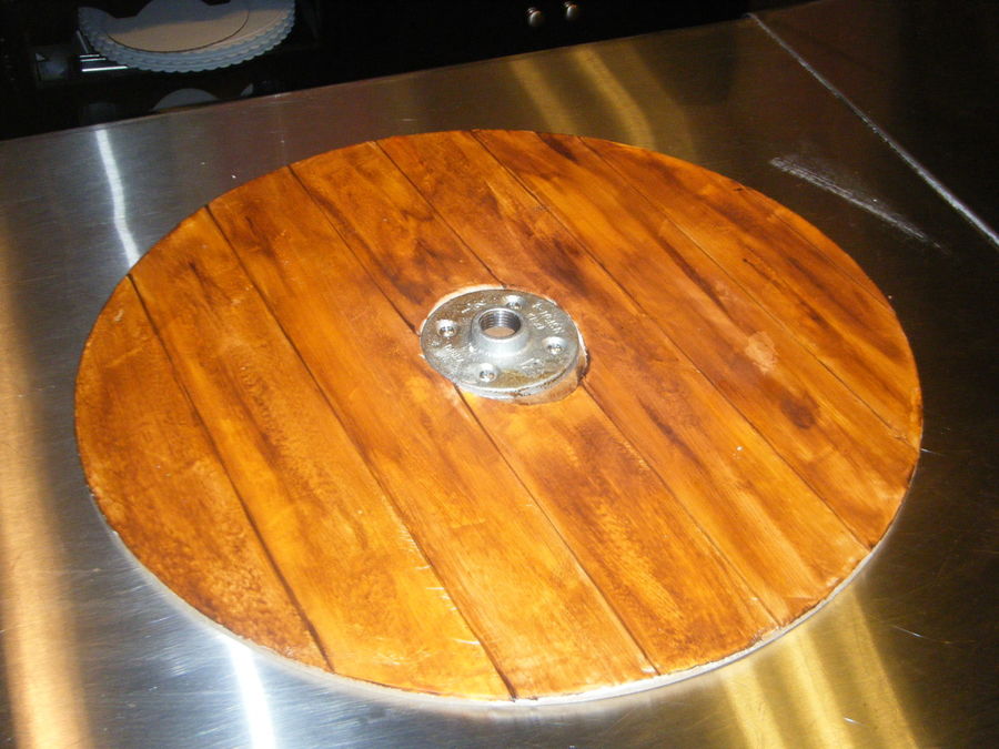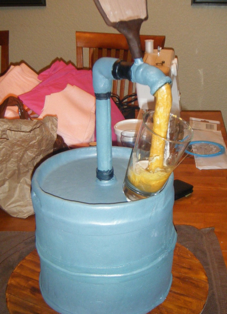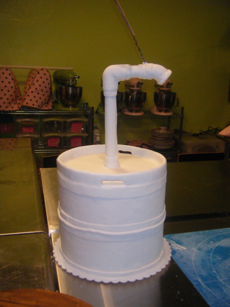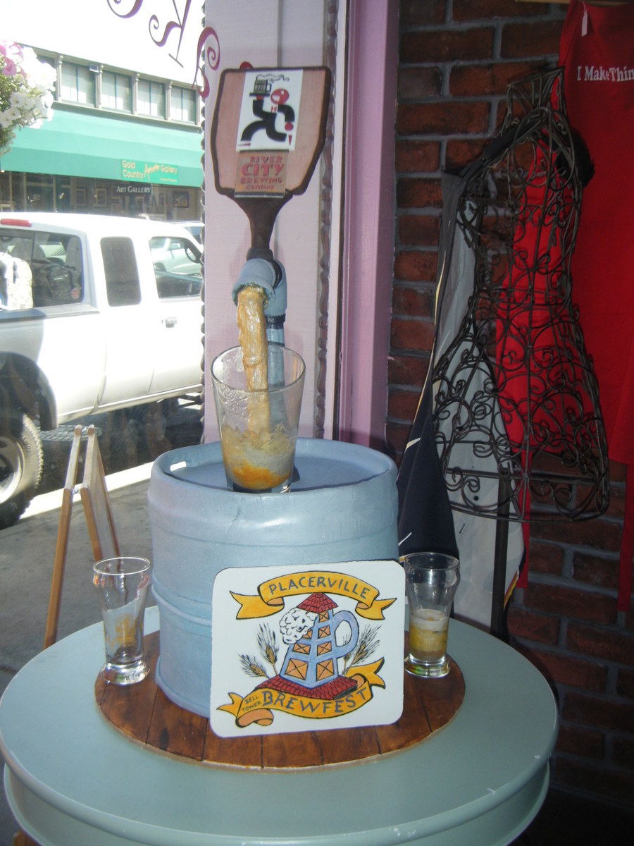 Window display to celebrate the annual brewfest on Main Street. Keg is made up of styrofoam dummies since it was in the window for a month. Masonite board covered in fondant and painted to look like wood boards. Keg and pipes covered and sprayed for the greyish aluminum look (dulled to blueish in extended sunlight). Tap handle covered and handpainted for the brewery logo. Flowing beer and glasses made with Gold sparkle gel.