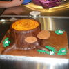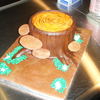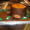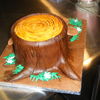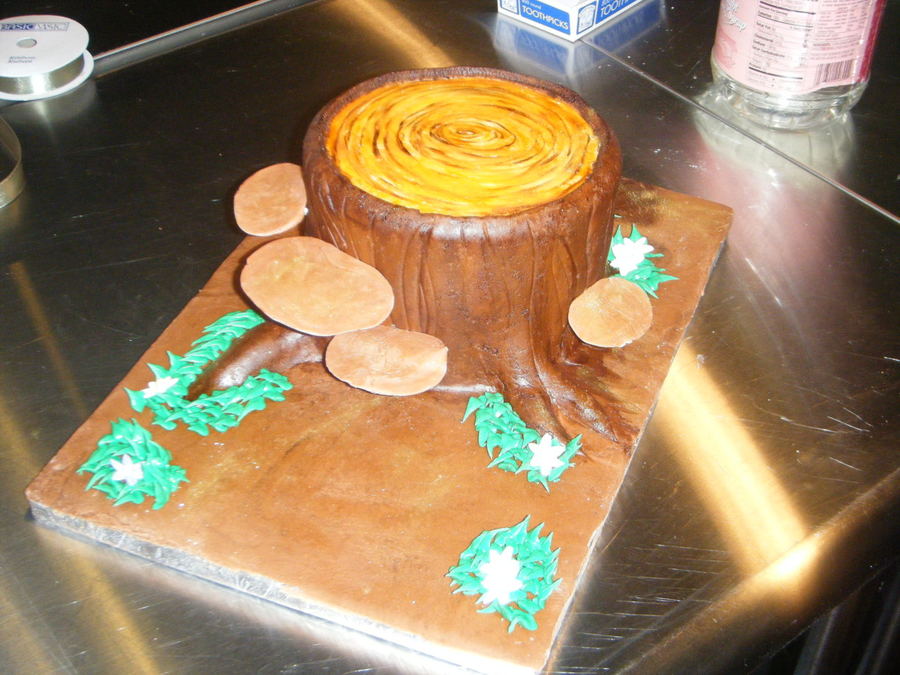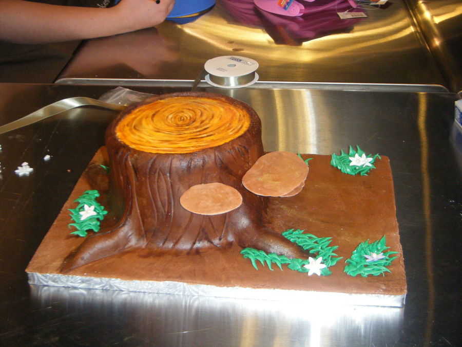 Request for small tree stump for a woodland fairy theme party. My first real detailed cake. Six inch cakes staked, cut out pan sized circle of white fondant for the top before covering cake and board with chocolate fondant. Cut chocolate fondant off the top to get to white layer and hand painted wood rings. Legs of tree are small rolls of fondant underneath. Toad stoles were gumpaste colored and shaped. Tree was painted to make it slightly darker than forest ground.