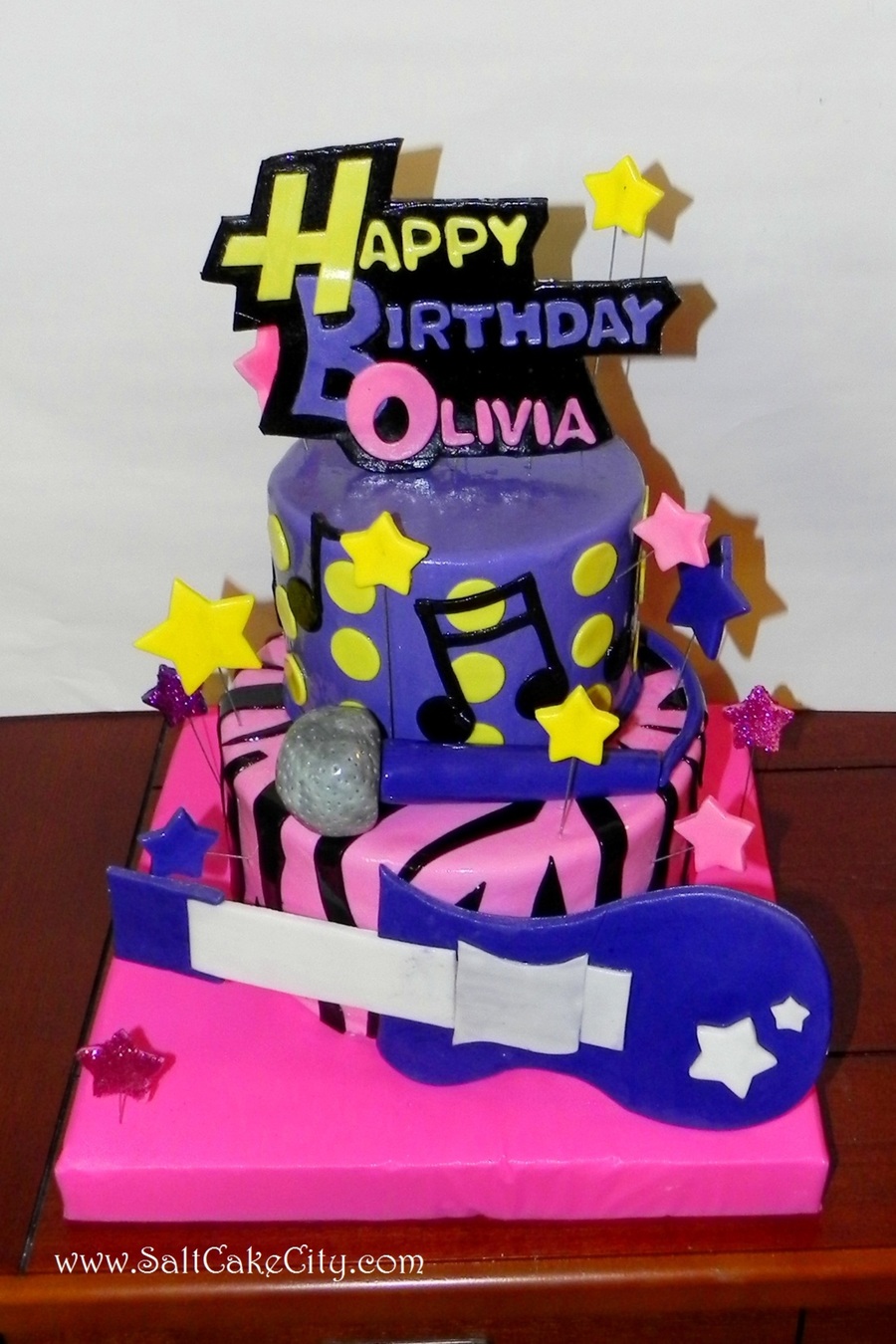 Everything on this cake is edible with the exception of the wires holding up the stars. If you know anything about Hannah Montana, you might recognize the purple guitar and the Happy Birthday Banner on top that's modeled after the Hannah Montana logo. I did a similar cake to this one a while back and Sophie loved it so much that she wanted something similar. We added the microphone in the middle tier because Olivia loves to sing. Although she was shy, I think Olivia was excited about it all :)