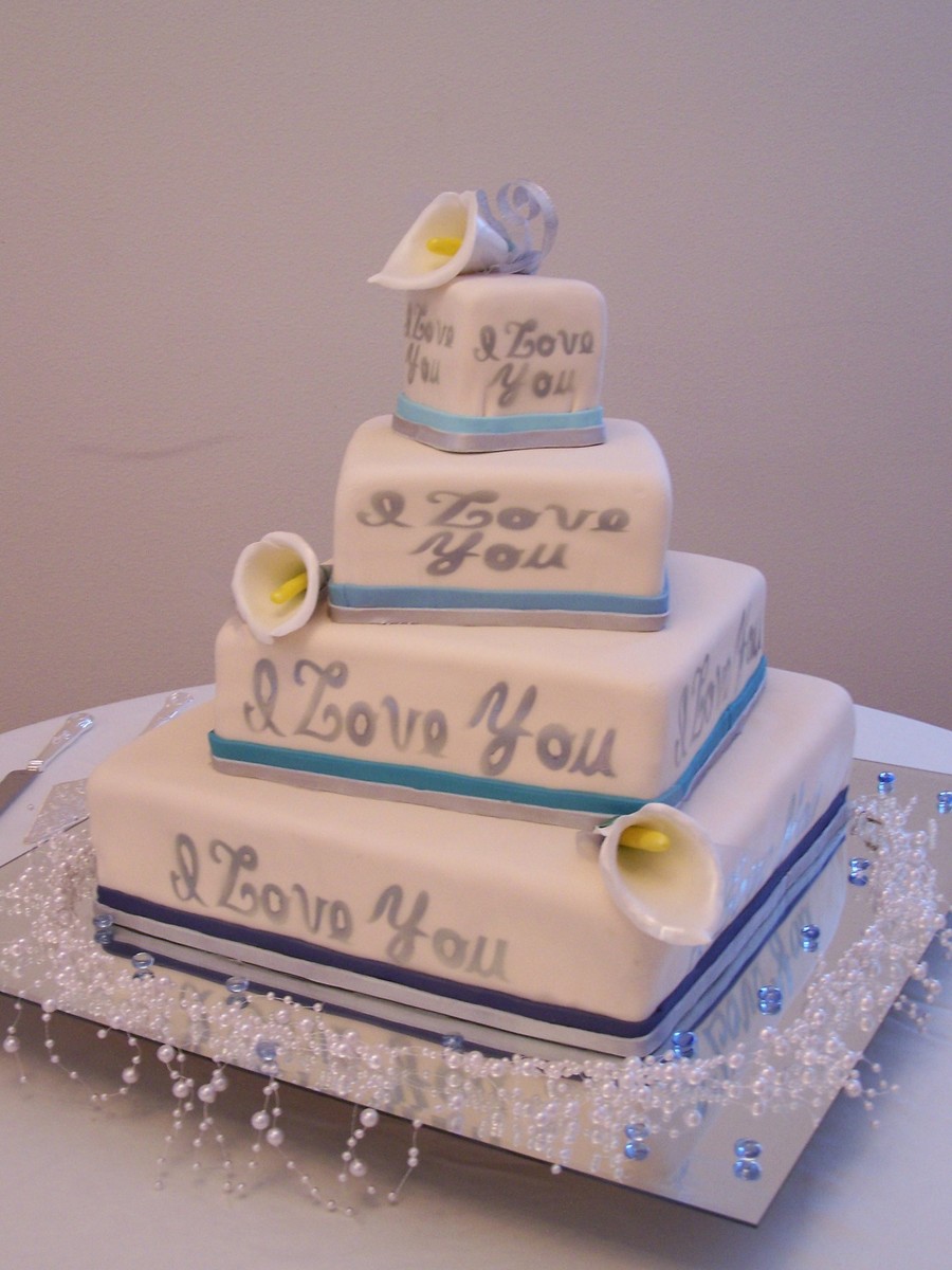 4 tier off center square (16, 12, 8, 4) with airbrushed phrases and gumpaste Calla Lillies.