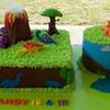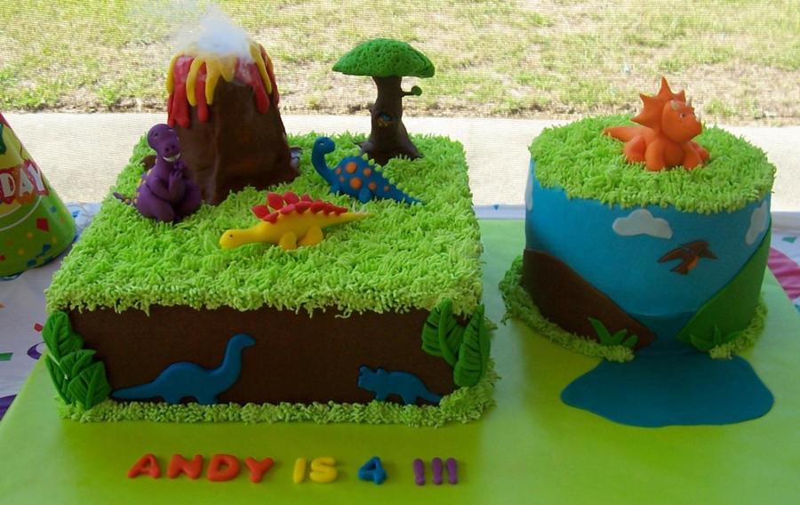 Round and square cakes. Chocolate and butter cream with fondant accents . I got the inspiration to make the fondant dinosaurs and volcano from other cakes I've seen here ( CC )