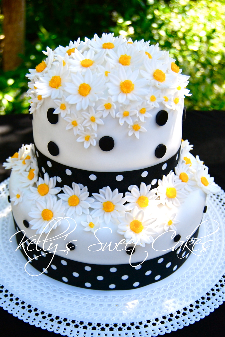 Chocolate buttermilk cake with a dark cherry buttercream. White fondant with fondant daisies and polka dot ribbon.