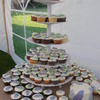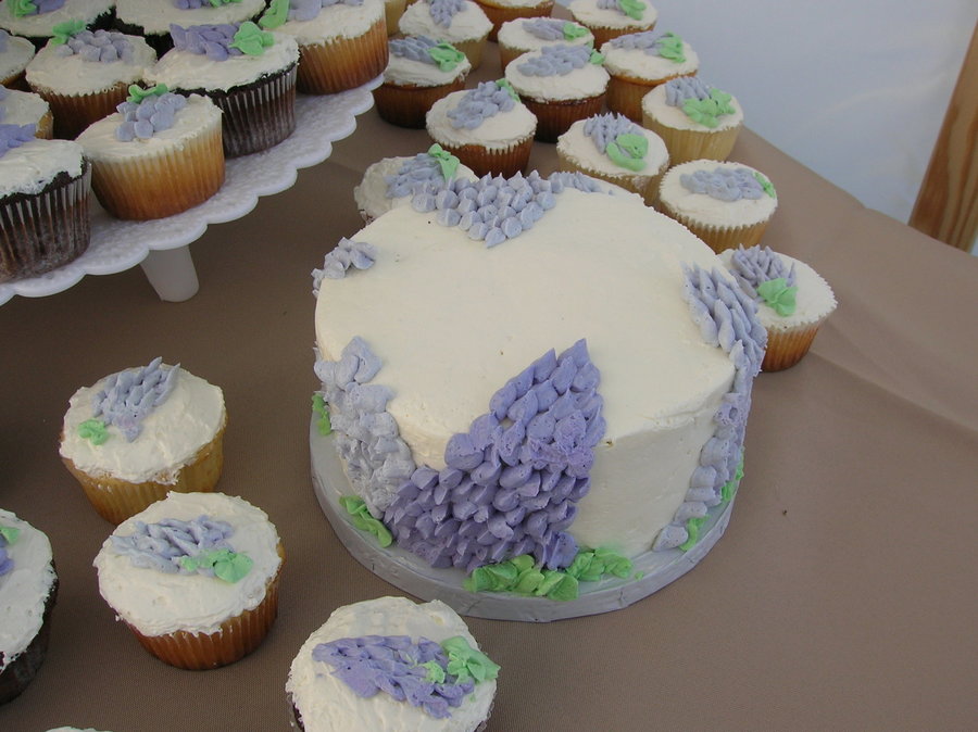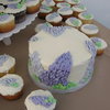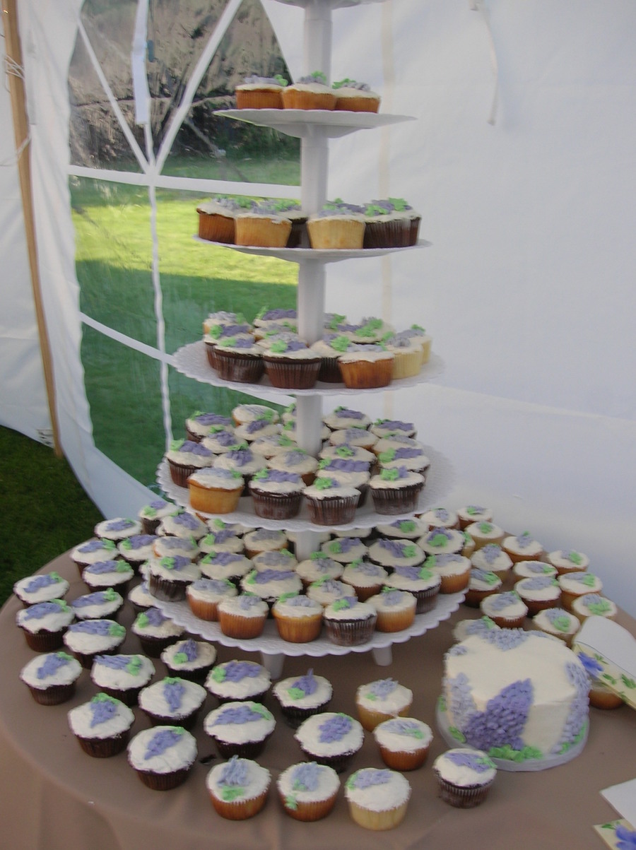 This is a multi-tiered cupcake tower with 150 cupcakes and a 6 inch cake decorated with 2 shades of Lilacs.