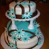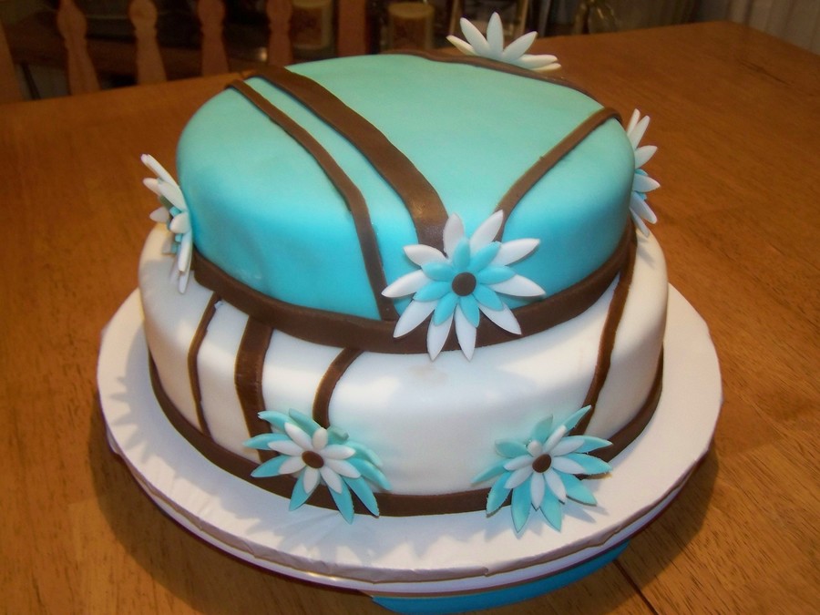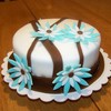 Inspired by AmyBeth's Little Sister's Wedding cake, this was my first tiered cake. French vanilla cake, covered in fondant, with fondant daisies & stripes. All edible (well except the plate). TFL!