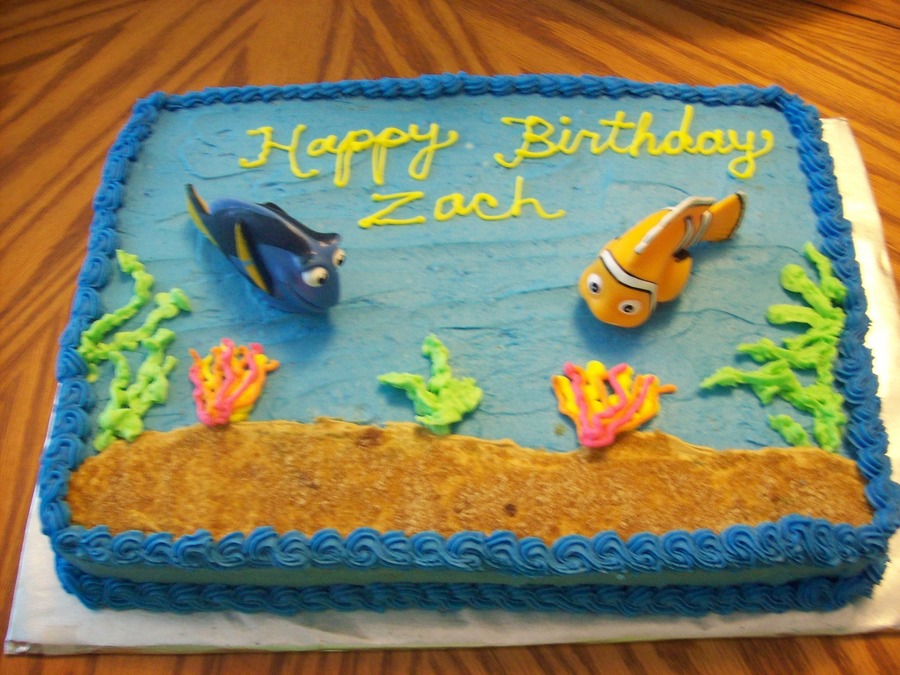 1/4 sheet cake of Disney's Finding Nemo. Seaweed was made using leaf tip. Sand was made using brown sugar.