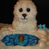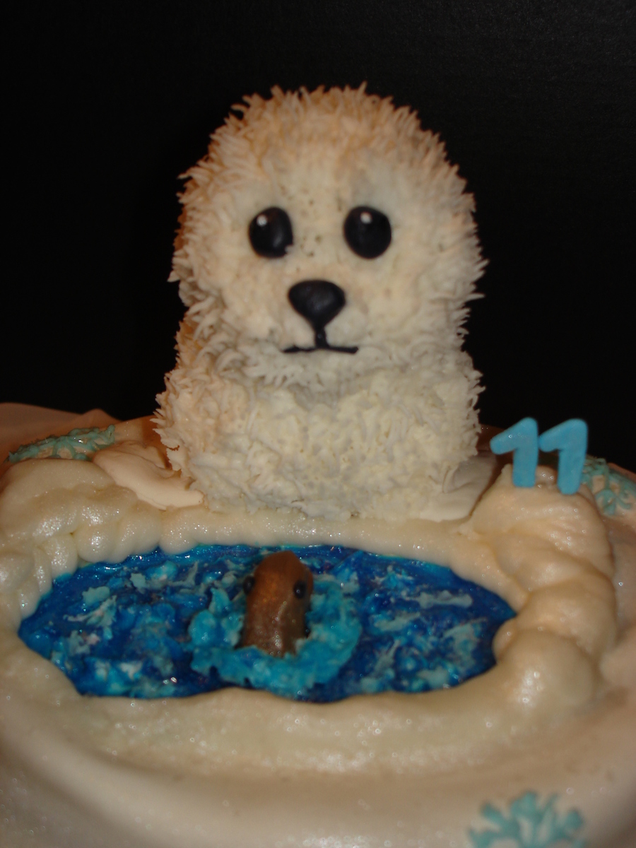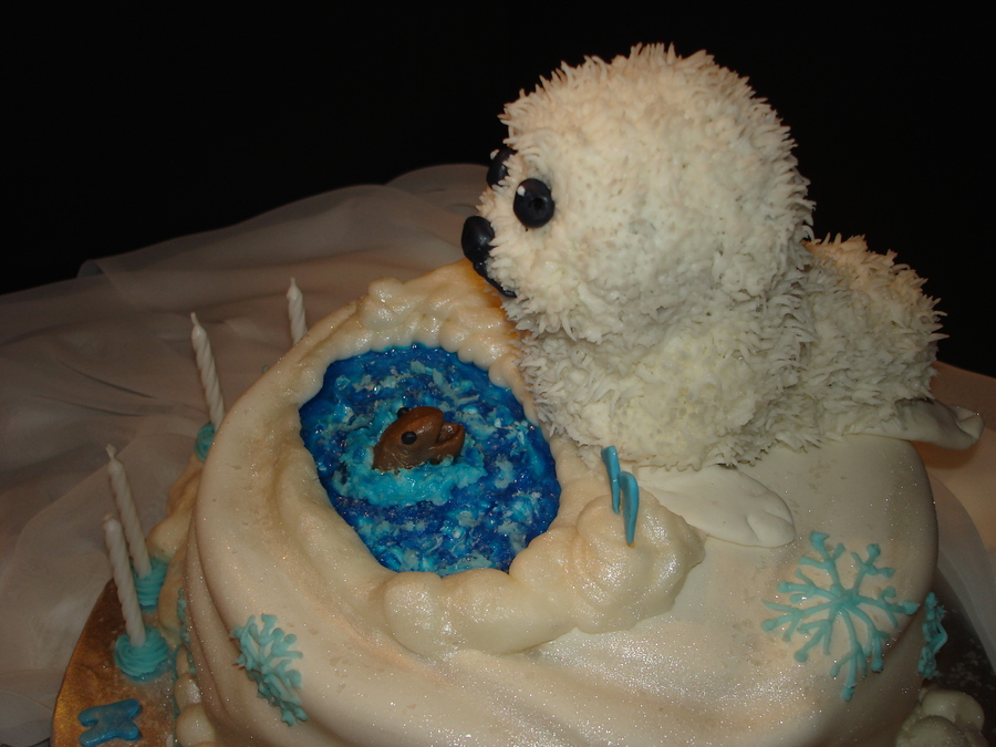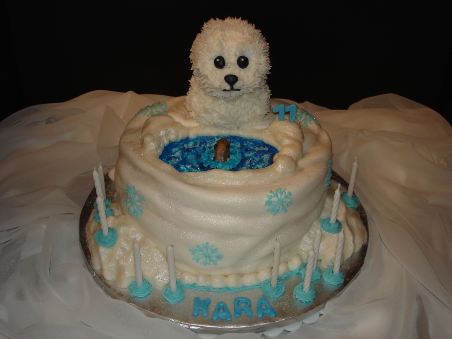 My daughter has always loved the baby harp seal, so for her birthday she wanted a artic iceberg cake with a baby seal. This is an 8" cake covered with fondant. The seal was carved and stacked from a one layer 6" chocolate cake, covered with buttercream using the grass tip. TFL