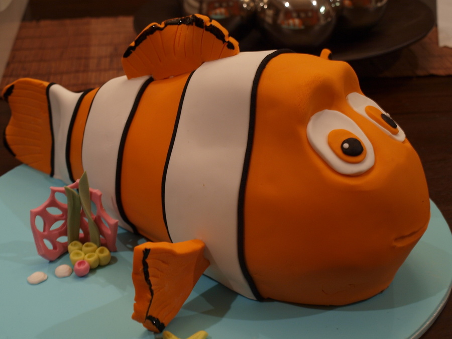 I made this cake for my niece's 2nd birthday, who loves Nemo! It's banana cake carved from a 7"circle tin, wilton small sports tin, small square tin & small rectangle tin. Covered in ganache and fondant. I've included a photo of the cake before it was ganached. Thanks for looking