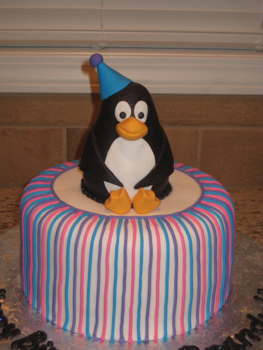8" round, covered in fondant. Penguin made from RKT & covered with fondant as well. I thought the little penguin came out super cute!:)