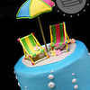 Cake was iced in sky blue buttercream. Bubbles were made with melted white chocolate and waves were made with white fondant snakes. Beach chairs and umbrellas were made ahead of time out of gum paste.
