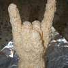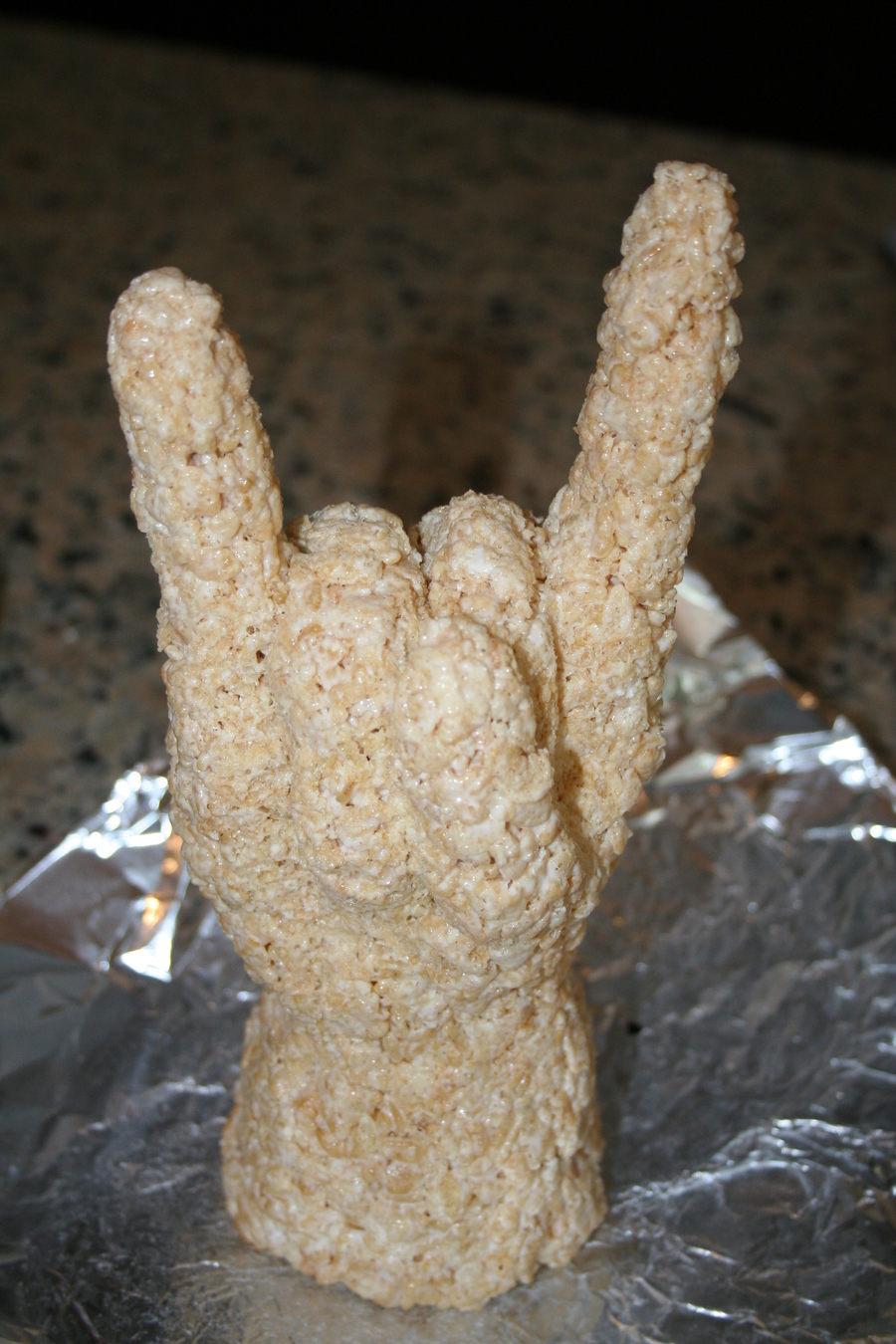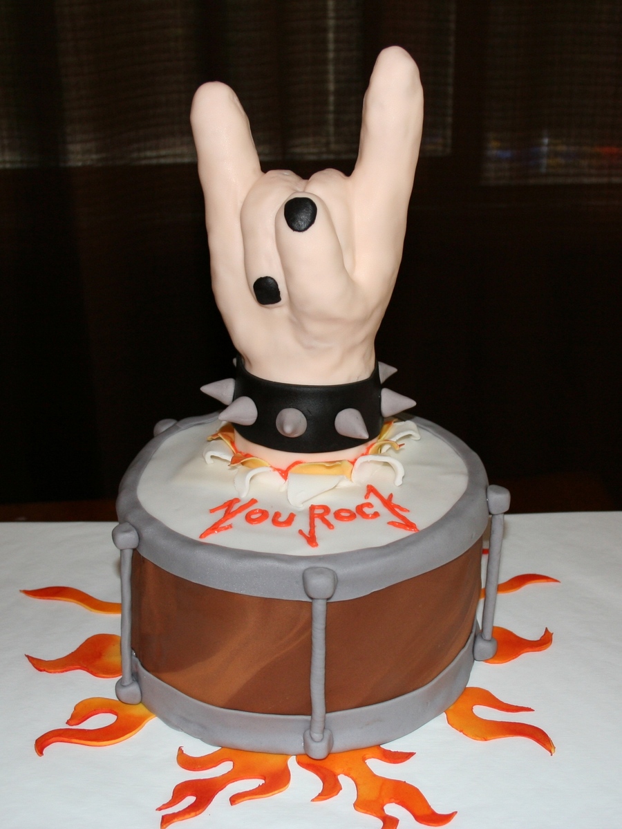 This was made as a joint birthday and good luck cake. Both people like Metallica. Hand is RKT covered in fondant. Cake drum is chocolate on chocolate, covered in marbled chocolate fondant. Lettering is buttercream. Flames are airbrushed gum paste.