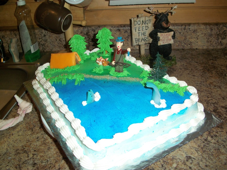 Got the fisherman from Walmart. The trees are iced pretzel sticks and the tent is fondant over graham crackers.