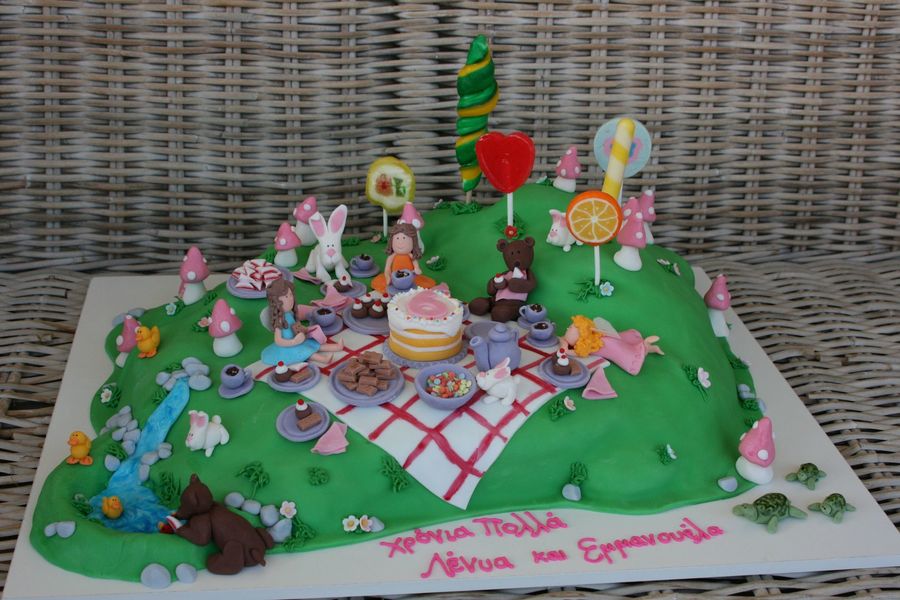 The cake is devil's food with chocolate ganache, covered in fondant. All details are made of fondant, except for the lollipops.