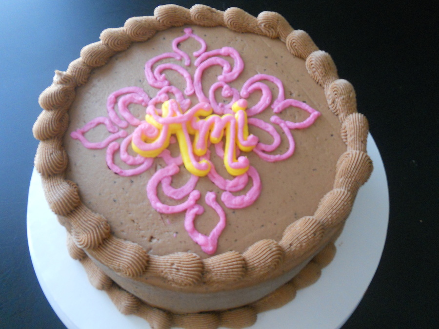 This is a chocolate cake, iced and filled with mocha buttercream. I used a stencil to make the design - I laid it on the cake, traced it with a toothpick then filled in with tinted vanilla buttercream. I like how it turned out, and now I want to buy more stencils! :)