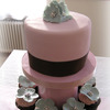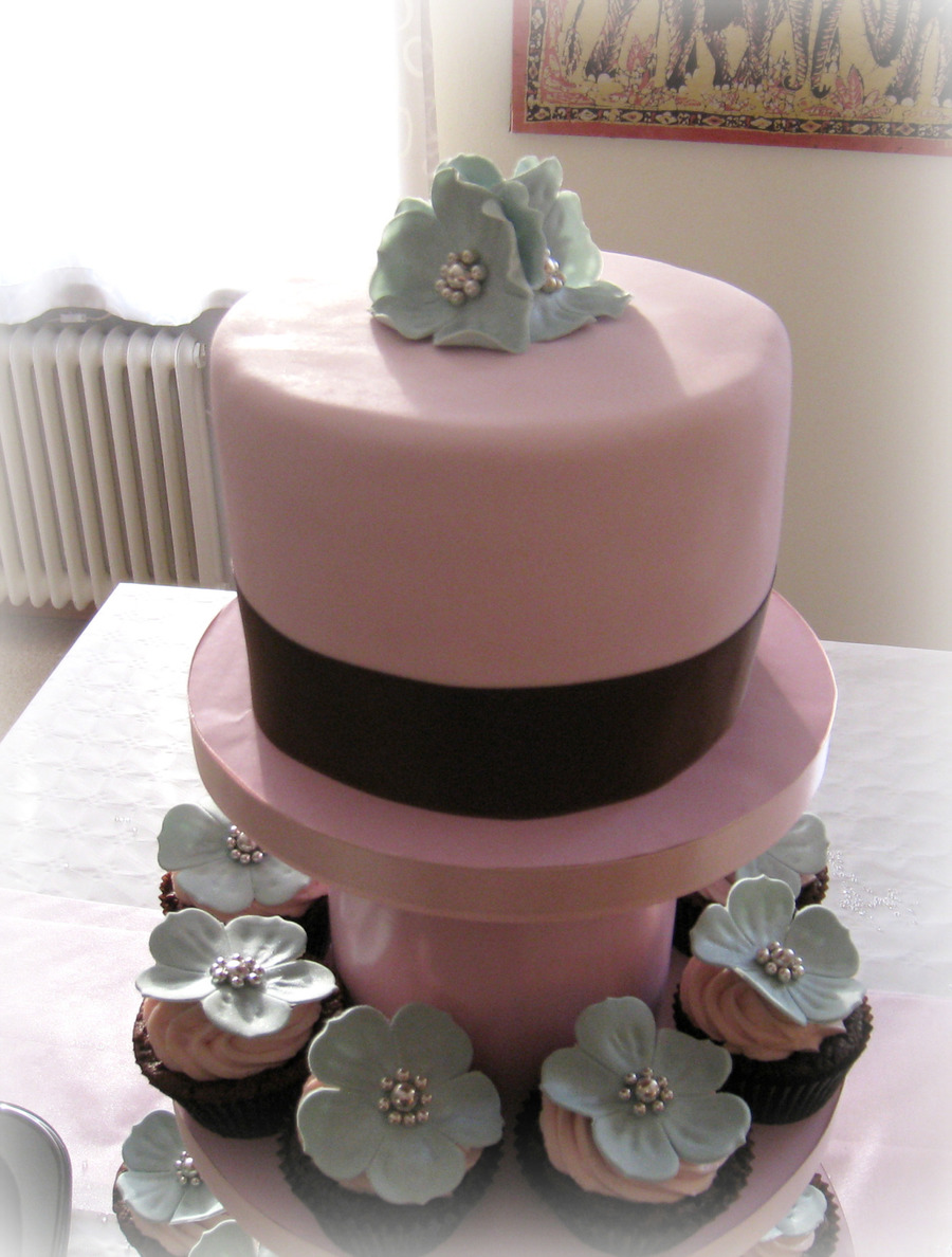 Brownie cake with raspberry/vanilla vodka mousse. Covered in fondant with gumpaste flowers and satin ribbon. Cupcakes are also brownies with a raspberry/vanilla vodka cream cheese frosting - the best frosting ever! My husband made me the stand from MDF-board and cutlery stands from IKEA :-) It's covered with wrapping paper and silk riboon trim. TFL!
