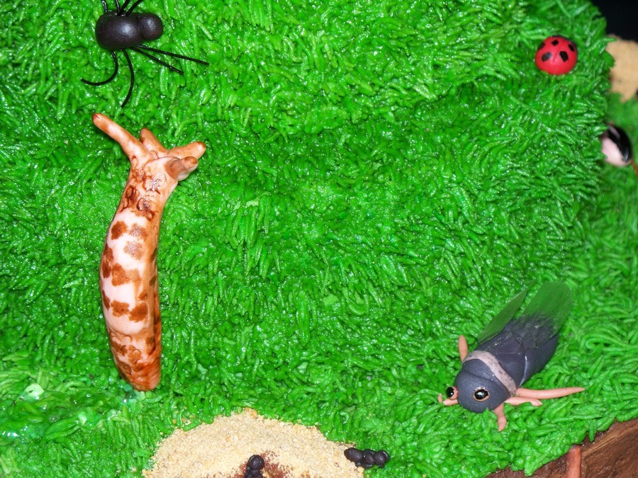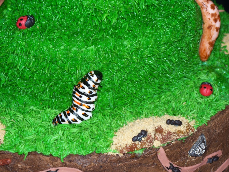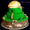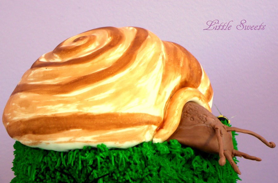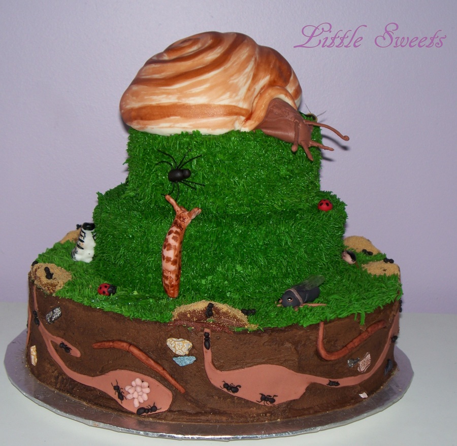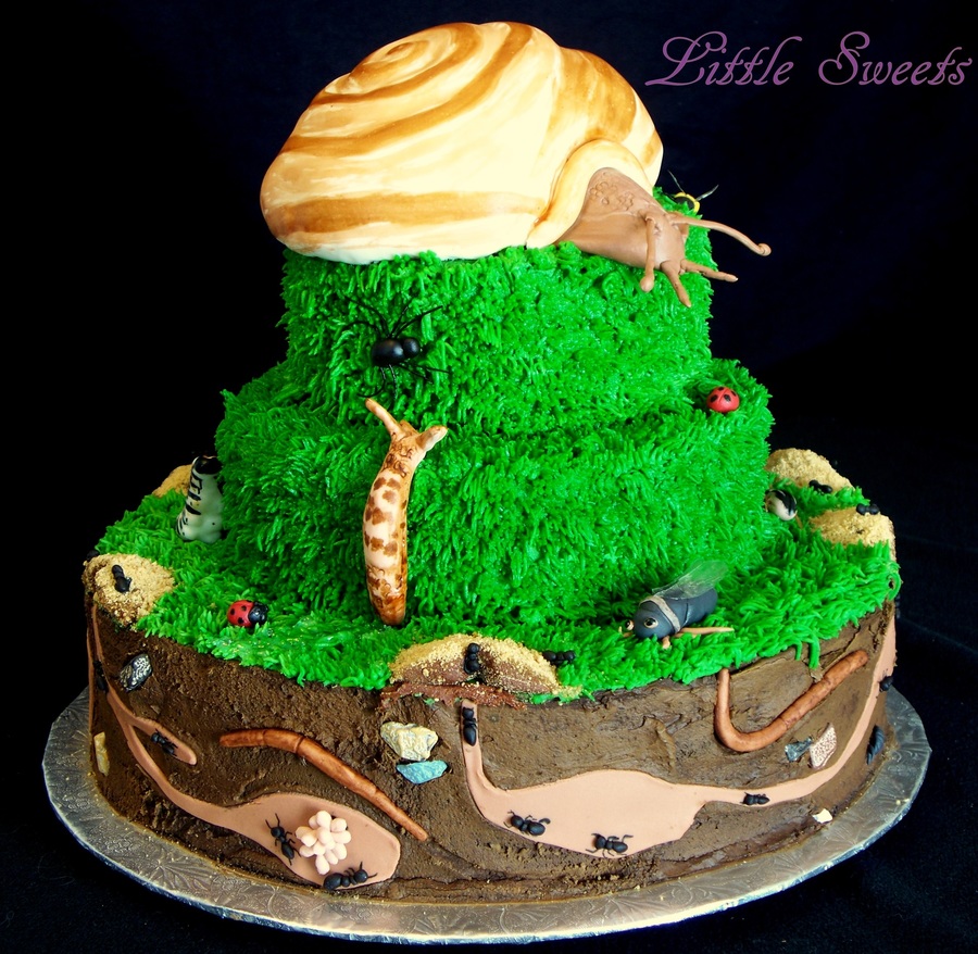 Four tiered cake, buttercream icing, fondant decorations. Snail is cake covered in rolled fondant. thanks for looking!