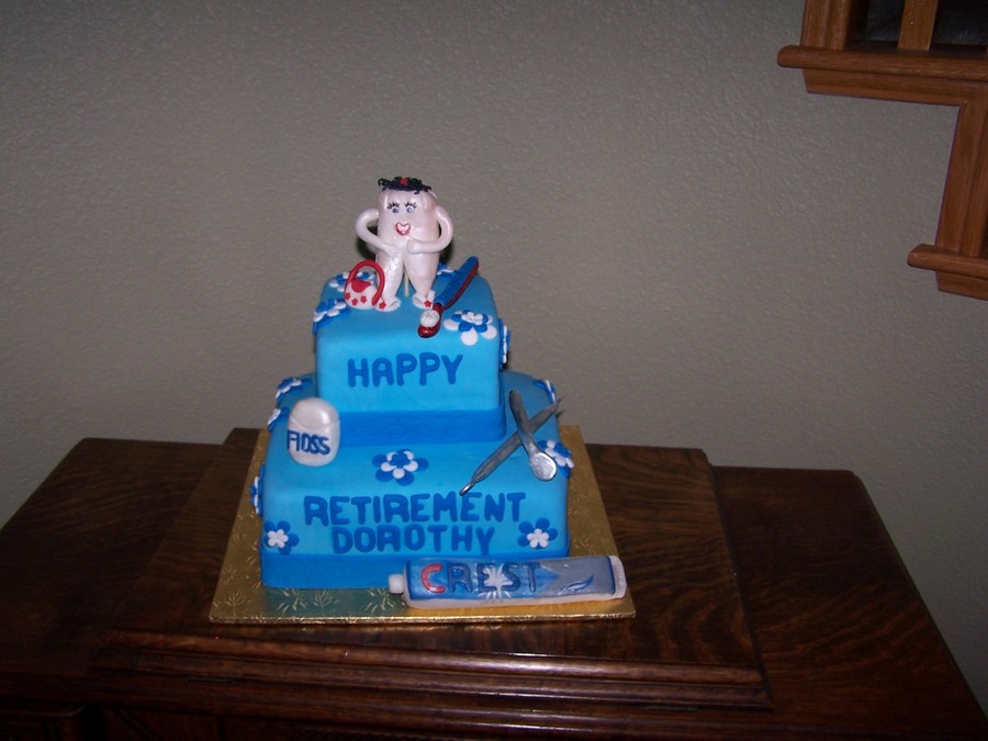 This was a retirement cake for a 30 year employee at a Dental Office. Cake is cover in Fondant and figures/dental tools are made out of fondant/gumpaste mix.
