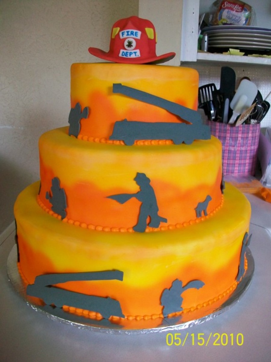 German chocolate cake with all butter buttercream and fondant icings. Each tier was air brushed to create the flame background, shadows are gum paste and fire hat is a combo of fondant and gum paste.