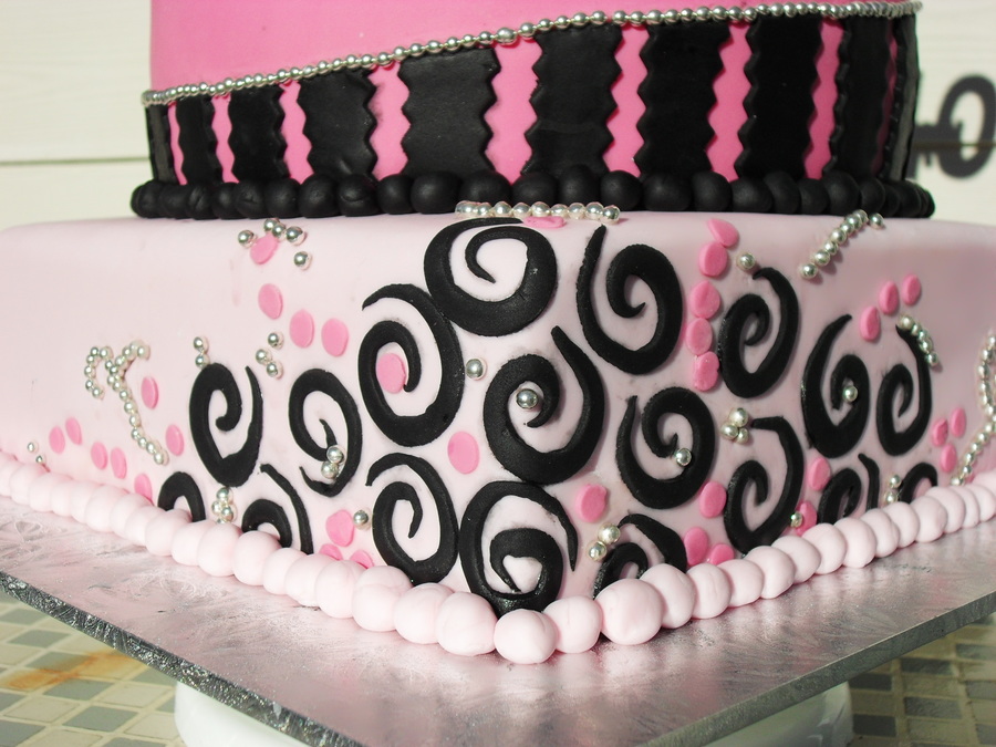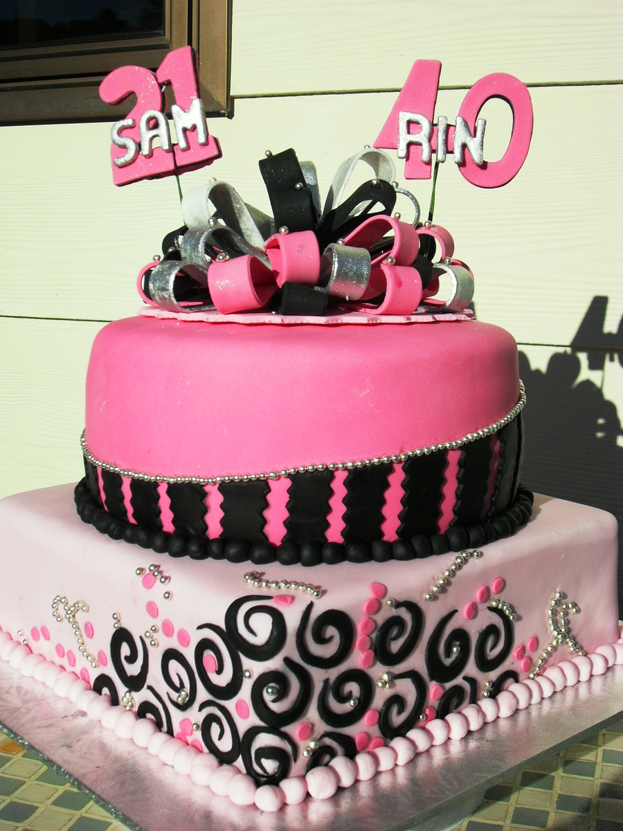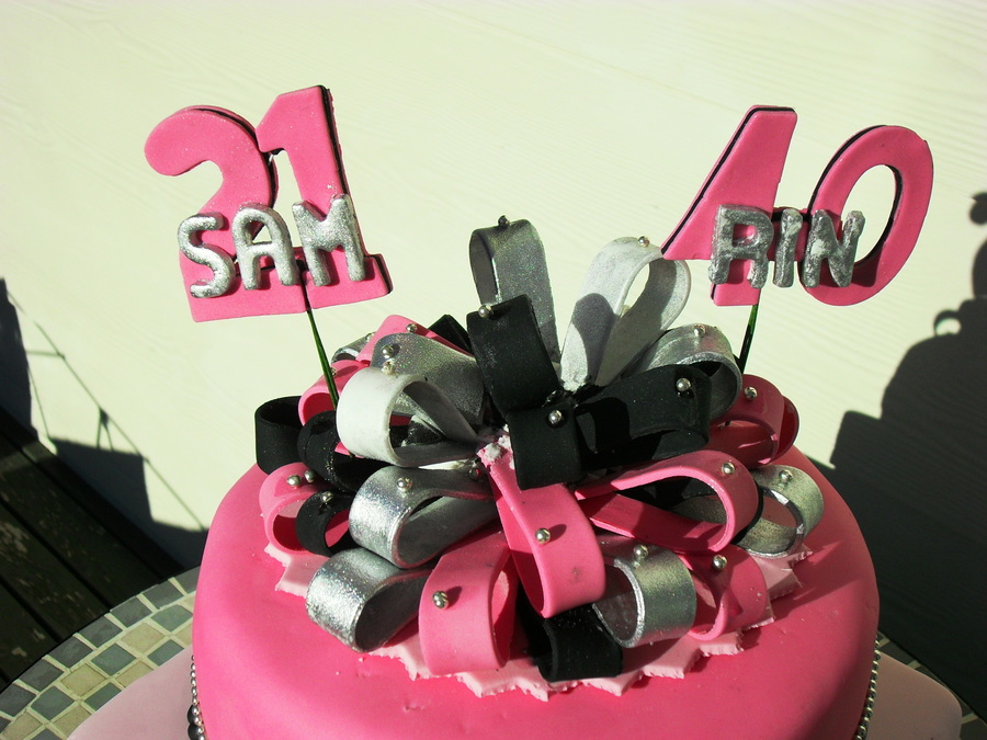 Combined 21st and 40th, mother and daughter cake, top layer carrot and bottom tier is chocolate. The bow is removable as the cake is going to be frozen and then thawed and I didn't think the bow was hold up to that. Really enjoyed doing the scrolls and thanks for the inspiration from others on this site. TFL