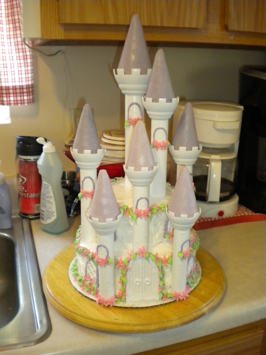 Romantic castle cake set, minus a couple pieces! I modified the set a little because we made a smaller cake. Fondant on the turrets, brushed with luster dust, fondant flowers and buttercream everything else!