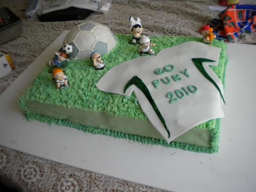 Half sheet cake, with soccer ball. Fondant sides, soccer ball, and jersey. Plastic soccer players (my mom had to have them, I thought they were a little goofy looking!) Everything else is buttercream. Chocolate layer on top of vanilla cake layer with cookies and cream filling.