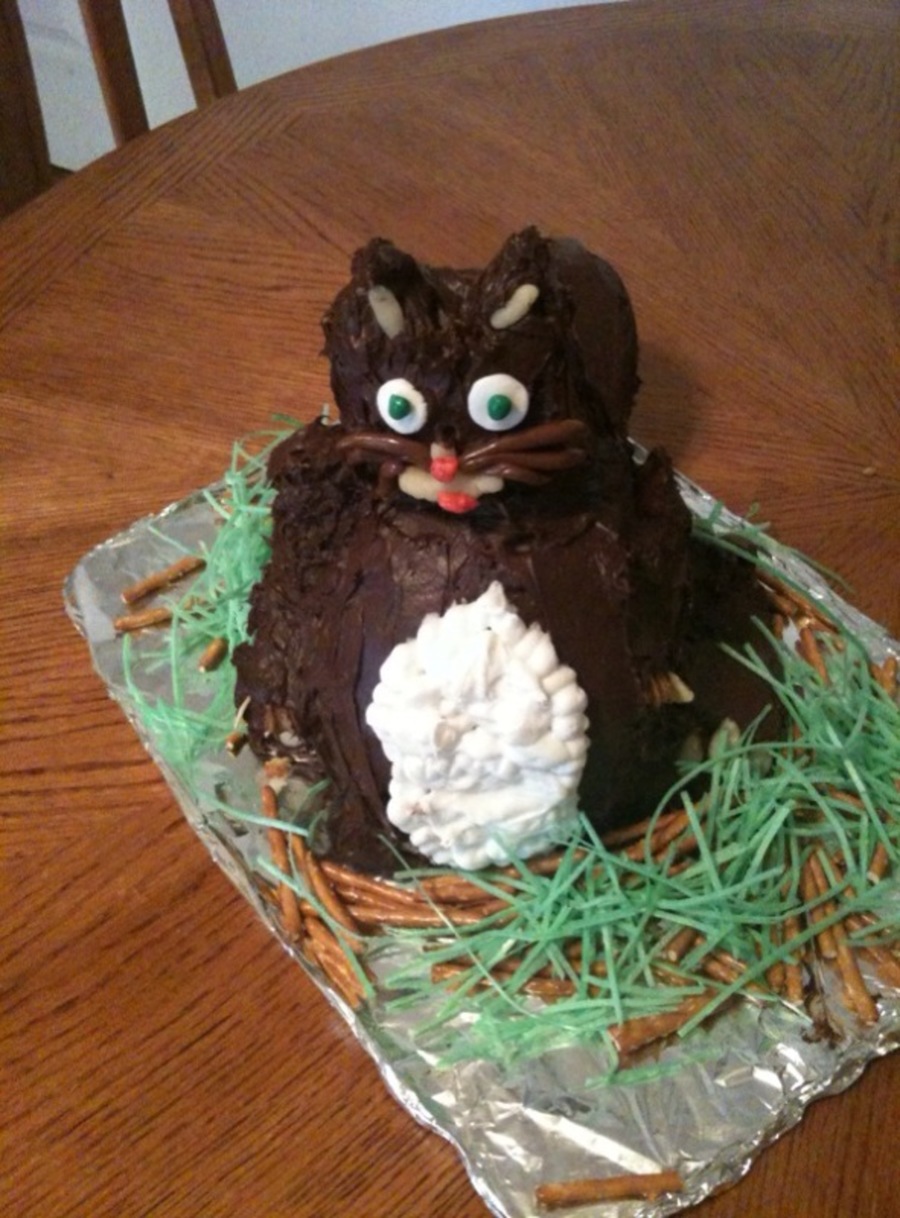 Made this for my neighbor to say thank you for the squirrel feeder he made for me!! I know it looks more like a fat cat!! Tail and head are RKT body french vanilla cake with vanilla and choc.frosting...Anothher FUN day making a cake!! TFL!!