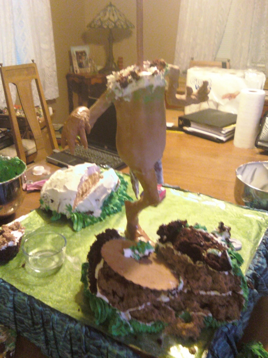 This cake was the first time I'd decided to enter a contest. I'm a self taught decorator all the way and I've learned everything through trial and error, the latter being a BIG part of my journey. This cake was going so well and then I turned my back to get more icing and SPLAT. His head fell off! After a minute or two of wondering what to do, I decided to just scrape off the old head and bake a new one. Lesson learned: too much icing on a sphere shaped cake WILL make it fall apart. On the second one I didn't do a dirty icing layer and he held up just fine.