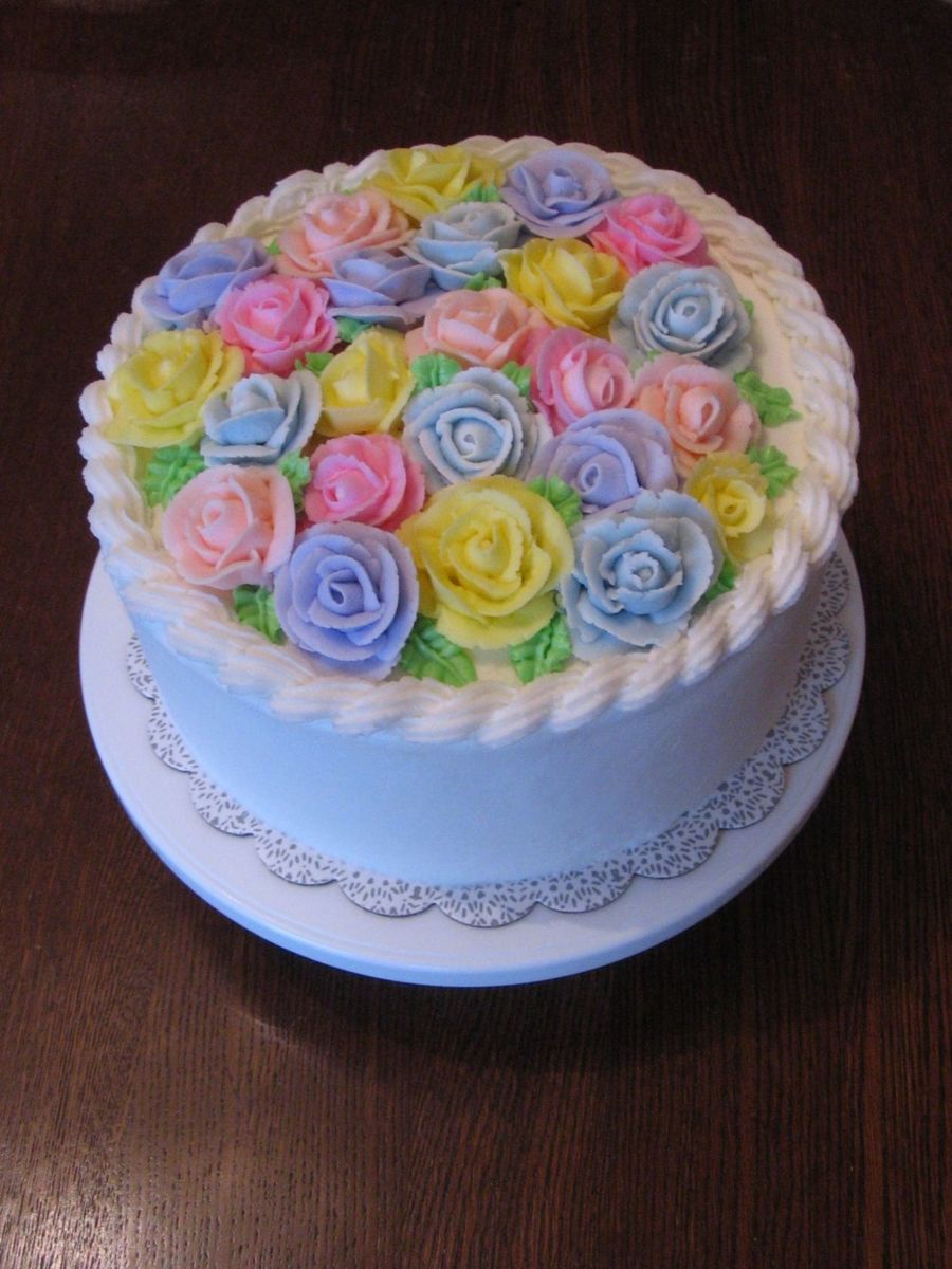This is a cake my neighbor asked me to do for her work. It's a two layer french vanilla with buttercream icing and roses. It's my first time trying a rope border. It came out pretty nice I think. I haven't done roses in a while so some were kinda sloppy but practice makes perfect they say. Thanks for looking! :-)