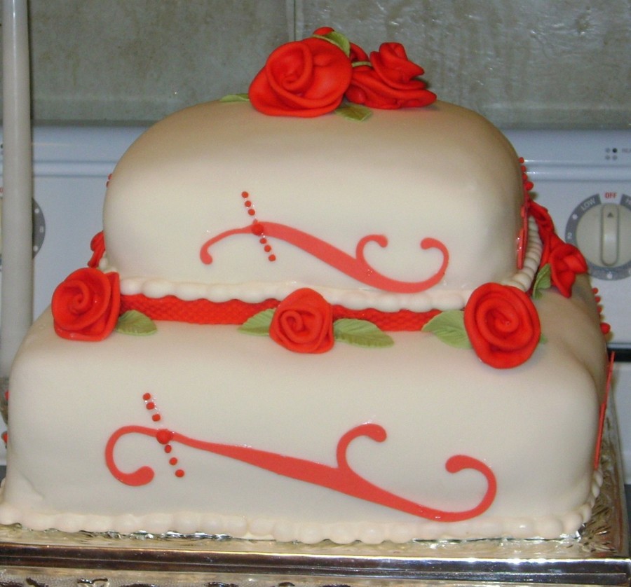 fondant covered red velvet w/cream cheese tort. Fondant roses, gp cricuit swirl.