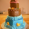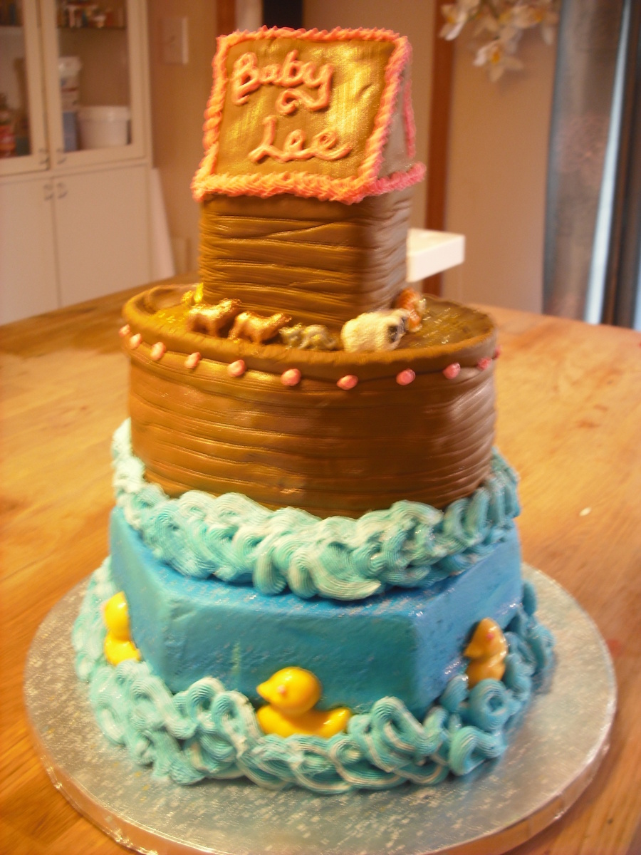 The client asked for an ark cake but liked the ducks from a cake she saw so I took her idea and really made her an ark. The animals are tiny molds I painted, the ark was the centerpiece.