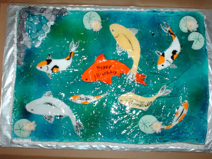 Got the idea from some other cake on here. Fondant fish,flowers,rocks and leaves. piping gel for water.. This is the 1st time I'm tried something so dramatic.