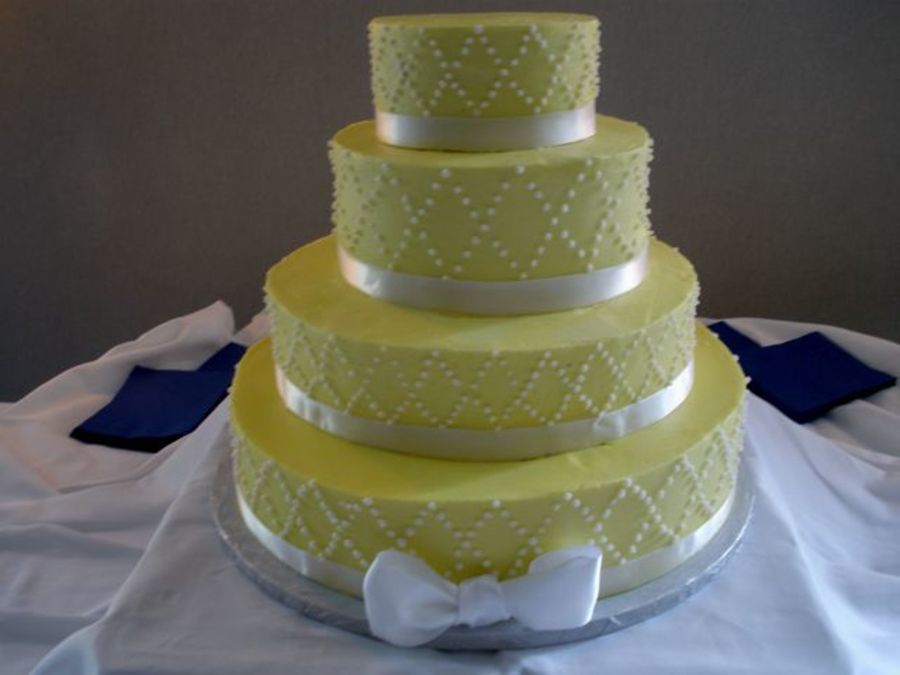 All buttercream with satin ribbon. 16, 12, 9 and 6. Bride brought me a photo of something similar.