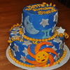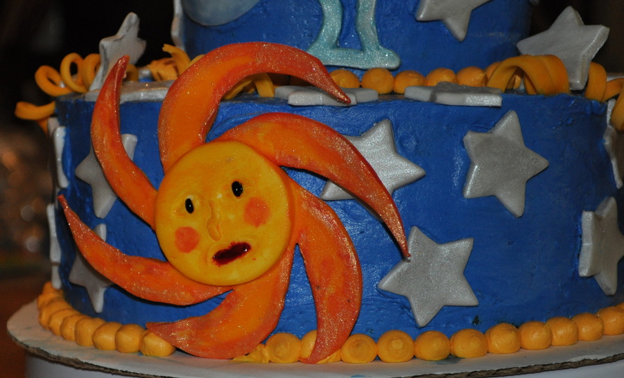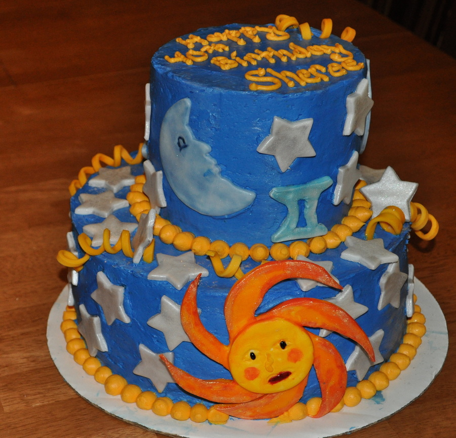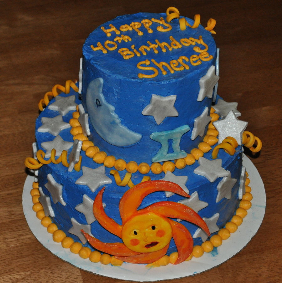 Yellow cake with Cream cheese filling Swiss Alpine Butter cream Frosting Fondant Stars, Moon, Gold curls. and Sun Gemini sign I did 40 stars for a 40th B-day cake and the Gemini zodiac sign for the Month of May