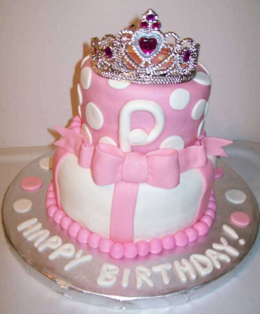 This is a chocolate cake with vanilla buttercream icing. It is topped with a princess crown and covered in fondant. The p is made from fondant and is the first letter of the birthday girls name