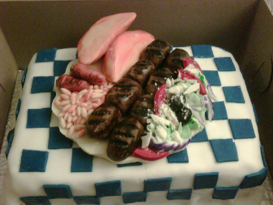 i made this cake for my best friend, (and owner of fast food chain mr greek) anyhoo cake is vanilla, covered in fondant tablecloth, plate is white chocolate, salad and rice are all fondant, and potatoes and souvlaki are rkt covered in fondant and hand painted, i had a great time making this!! thanks for looking!!!