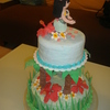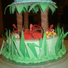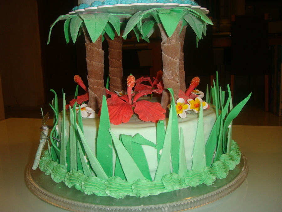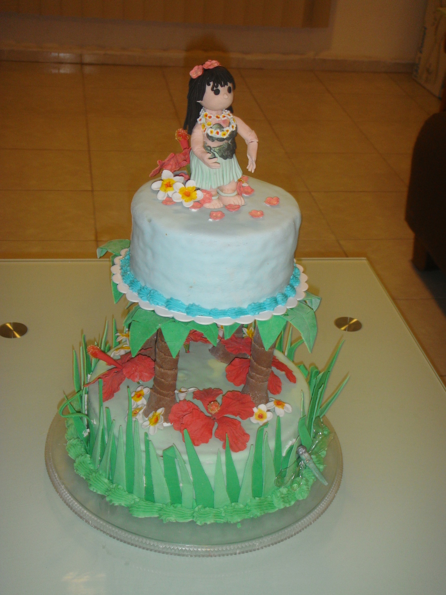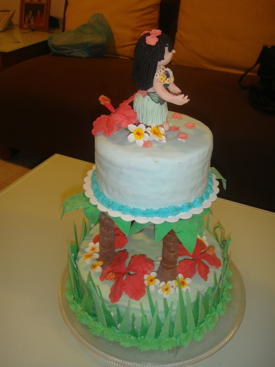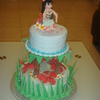 For a woman who teaches Hawaiian and Tahitian dancing and her students. She gave me a doll to model the topper on as well as the hibiscus flowers. I found out that if you add too much CMC to your fondant, it becomes rubbery and won't hold a shape, so the topper was really hard to make and not at all what I wanted. But I was very happy with the "palm trees" I made around the separators.
