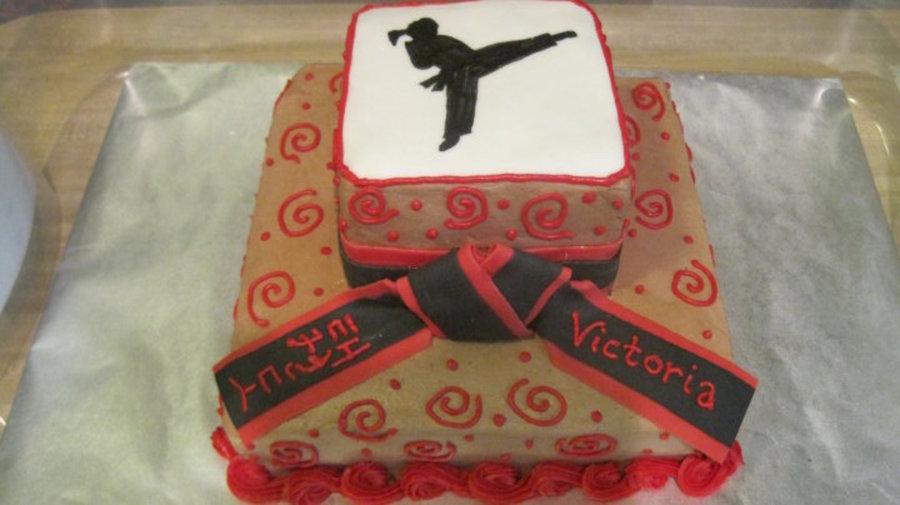 White cake, chocolate icing, fondant belt. Image drawn in edible ink on a flat piece of gumpaste.
